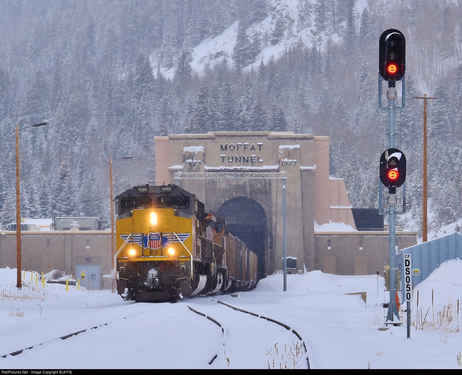 Snow and sub-freezing temperatures greet UP 9088 (SD70ACe) as it exits the east portal of the Moffat Tunnel in Tolland, Colorado.