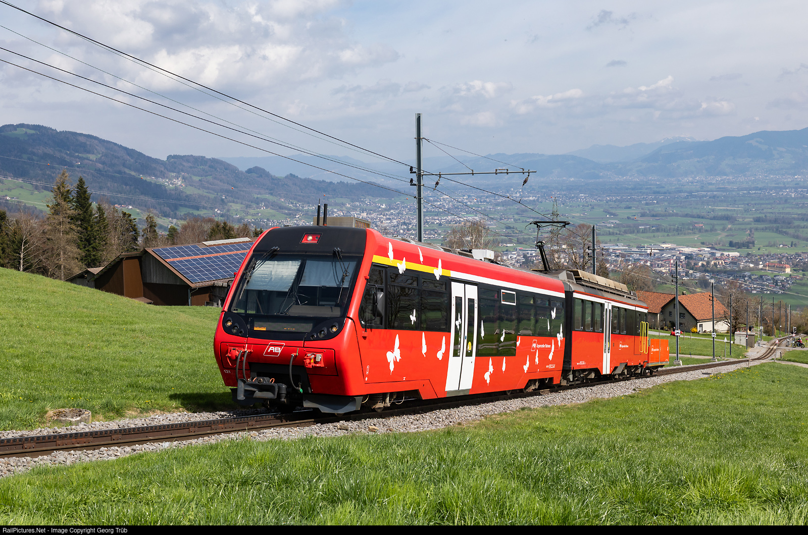 The 7.65-kilometre-long, meter-gauge line from Altstätten Stadt to Gais via Stoss with several rack sections (Strub system) with a maximum gradient of 16 % was built in 1911 by the Altstätten-Gais Railway, was later part of the SGA (St.Gallen-Gais-Appenzell-Altstätten Railway) and has belonged to Appenzeller Bahnen since 2006. The trains, consisting of a BDeh 4/4 cogwheel railcar and an ABt driving trailer, run every hour. Train 3138 on the S24 line from Altstätten Stadt to Gais is between the Warmesberg and Kreuzstrasse stops with ABt # 121 driving trailer, BDeh 4/4 # 16 railcar and X # 1001 bicycle transport carriage. In the background the Rhine valley and the mountains in Vorarlberg/Austria.