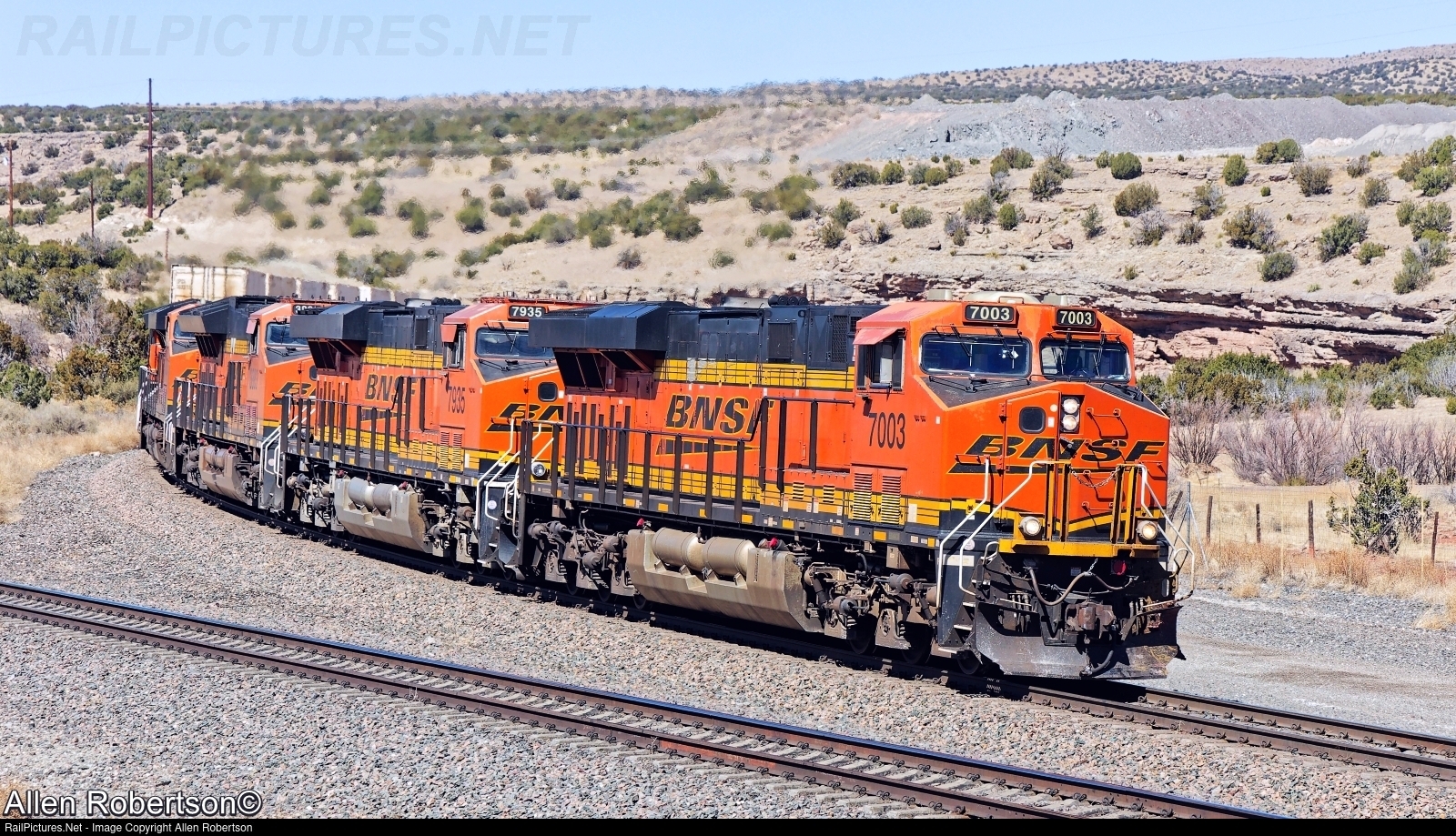 | BNSF 7003, 7935, 3883, 7393, & 3822 lead an eastbound stack train out of Abo canyon. |