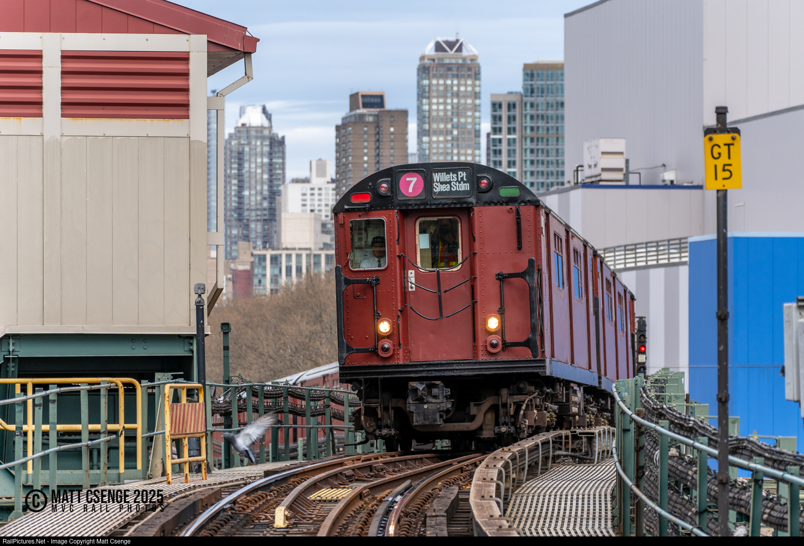 On April 4, 2025, the NY Transit Museum operated a nostalgia ride on the IRT Flushing Line for the Mets Hope Opener at Citi Field, using a train of eight "Redbird" cars from the 1960s! Here we see R36WF no. 9586 leading the train up the BMT tracks into Queensboro Plaza, where they will cross over to the Flushing Line.
