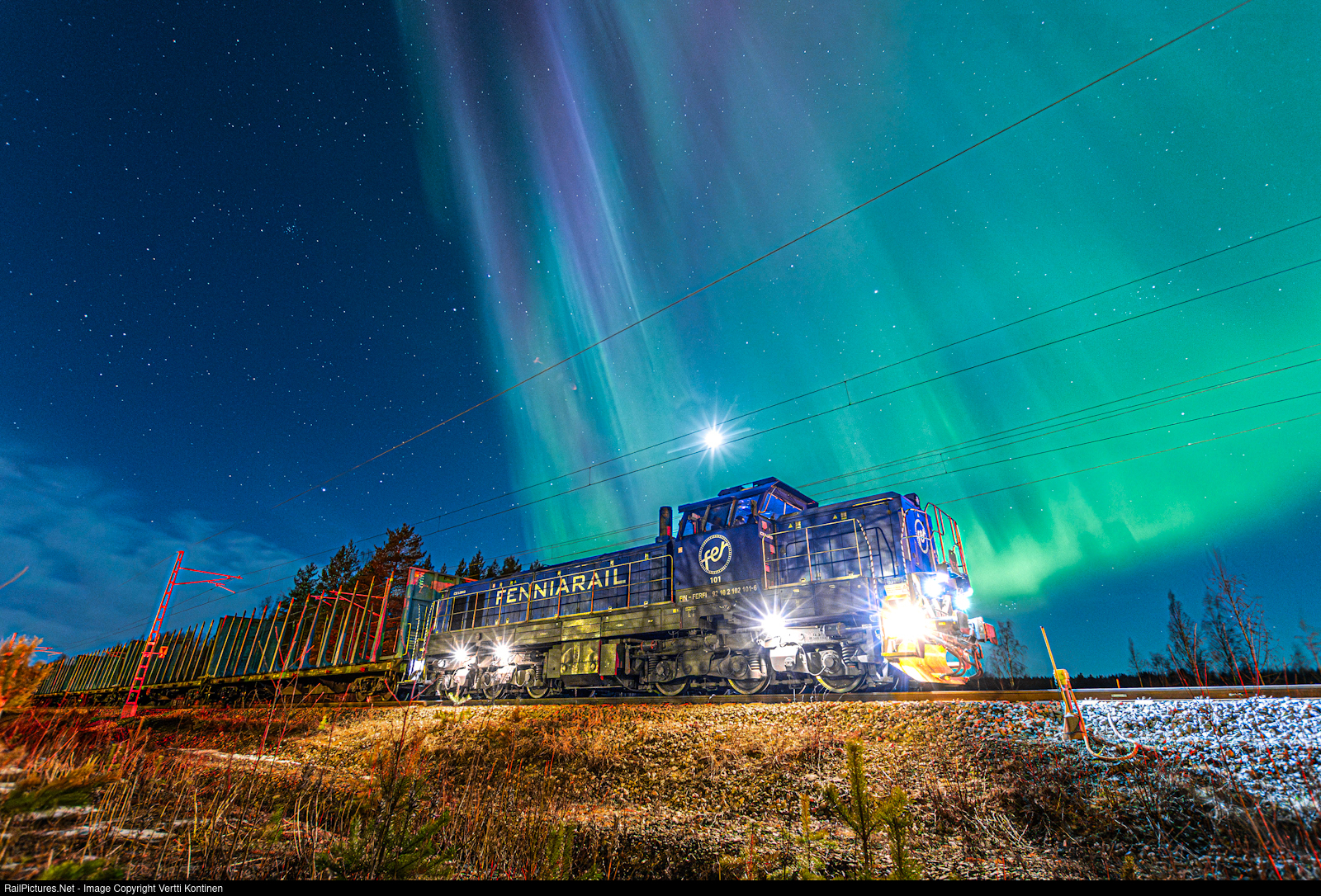 | After a tree fell on the overhead catenary between Vihtavuori and Suolahti, all traffic came to a stop for around three hours. One of the trains, among two others was T 7145, an empty timber train from Kouvola to Suolahti operated by Fenniarail Oy which had to wait for three hours at Vihtavuori for the tree to be cleared and catenary fixed. Also a beautiful aurora show made an appearence during the traffic stop. |