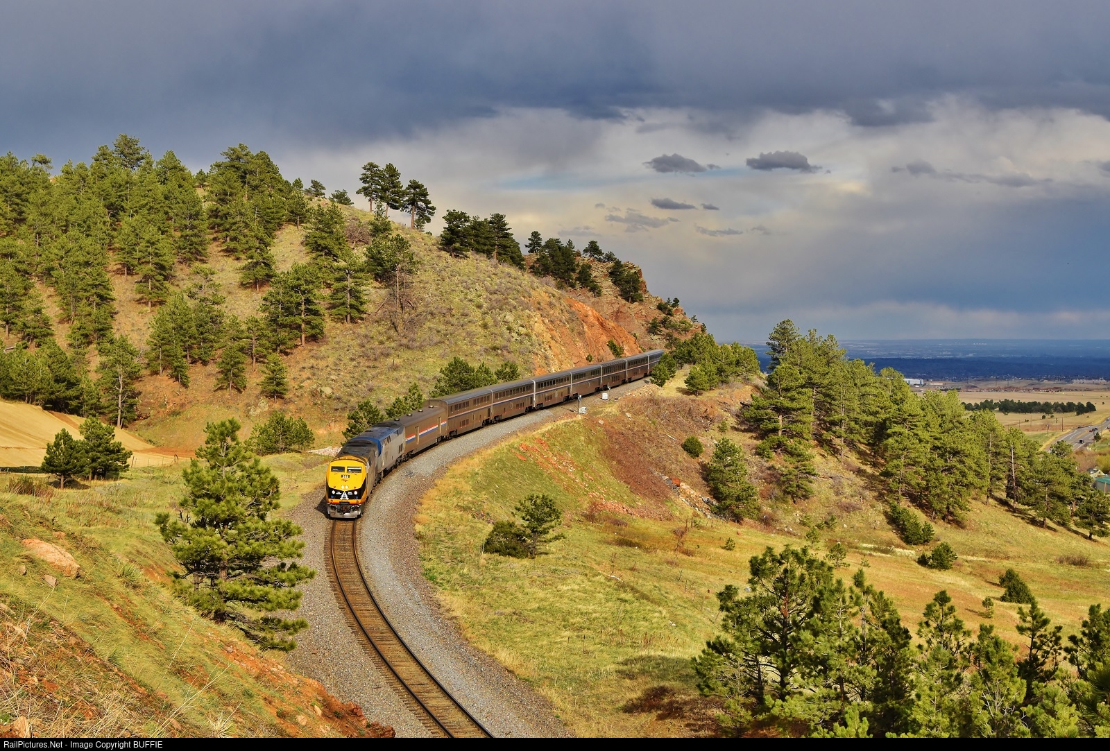 Evening storm light and thunderstorms in the distance frame the California Zephyr as it runs down the grade from Tunnel #1 at Plainview, Colorado.