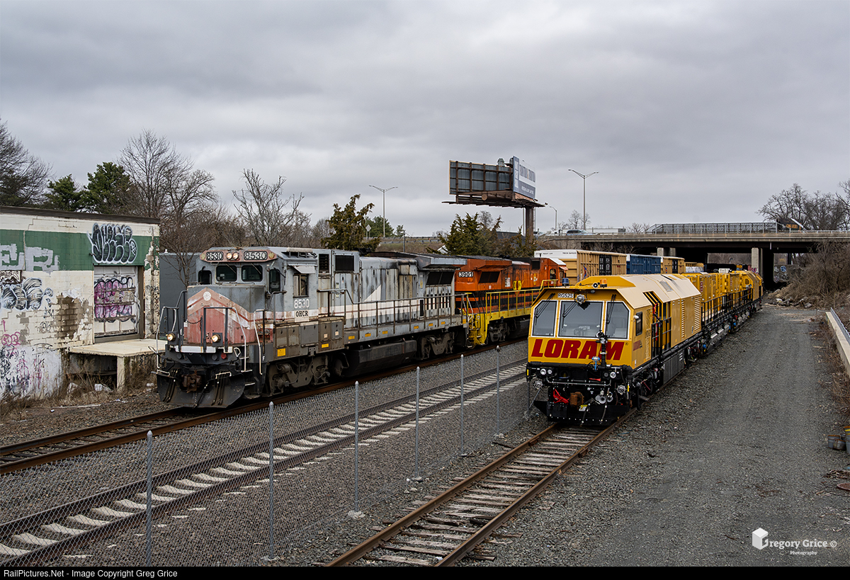 On a gloomy March 20th, 2025 afternoon, Connecticut Southern Railroad CSO-4, with OHCR GE B39-8E #8530 in the lead, passes a Loram RGS Specialty Rail Grinder sitting on the Russo Salt track just north of Midland Interlocking in Hartford, Connecticut on the MRS (Hartford) Line.