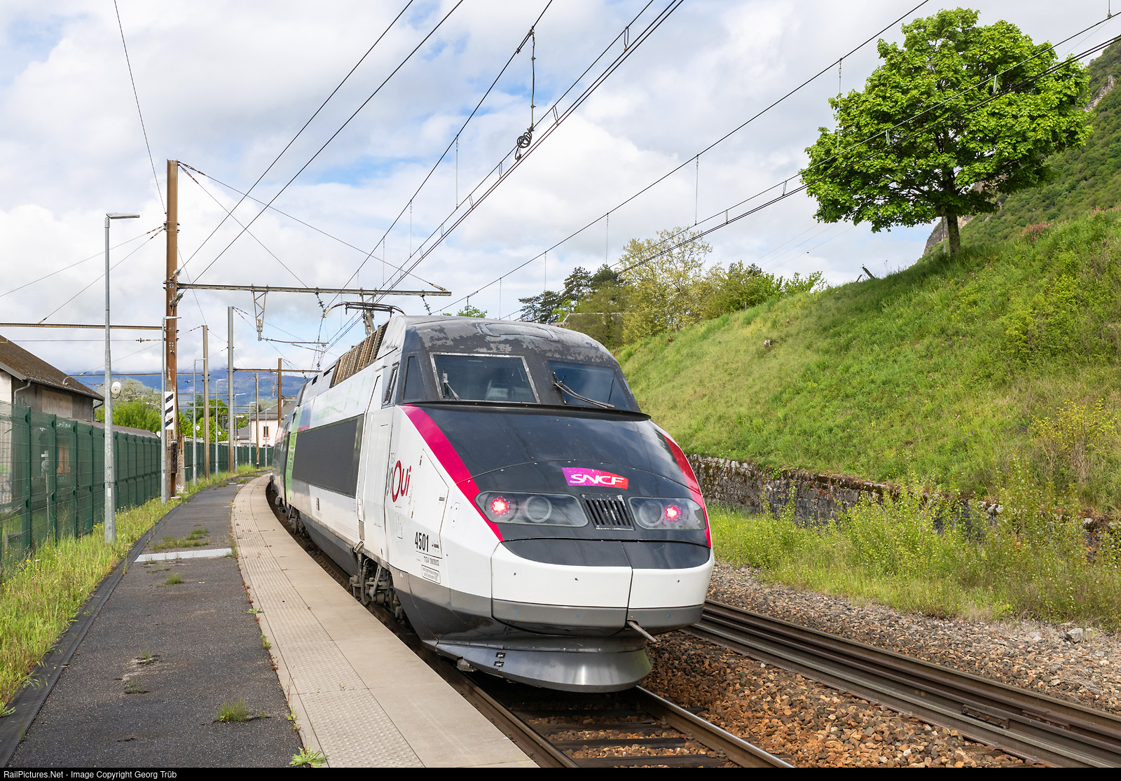 | TGV Réseau # 4501 of the SNCF is running through Montmélian on the Mont Cenis line as TGV 9242 from Milano Porta Garibaldi via Torino Porta Susa - Oulx-Cesana-Claviere-Sestriere - Modane - Saint-Jean-de-Maurienne-Arvan - Chambéry-Challes-les-Eaux to Paris Gare de Lyon. Departure was at 06 AM, arrival will be at 01.30 PM. |