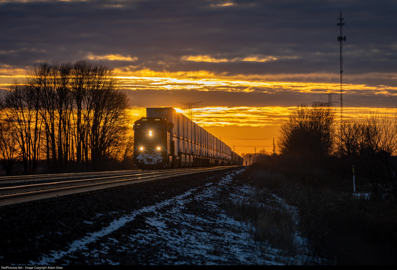 | A Q train from Tacoma in its final stretch before arriving at its destination of Logistics Park Chicago in Elwood as the sun begins to set for the day. |