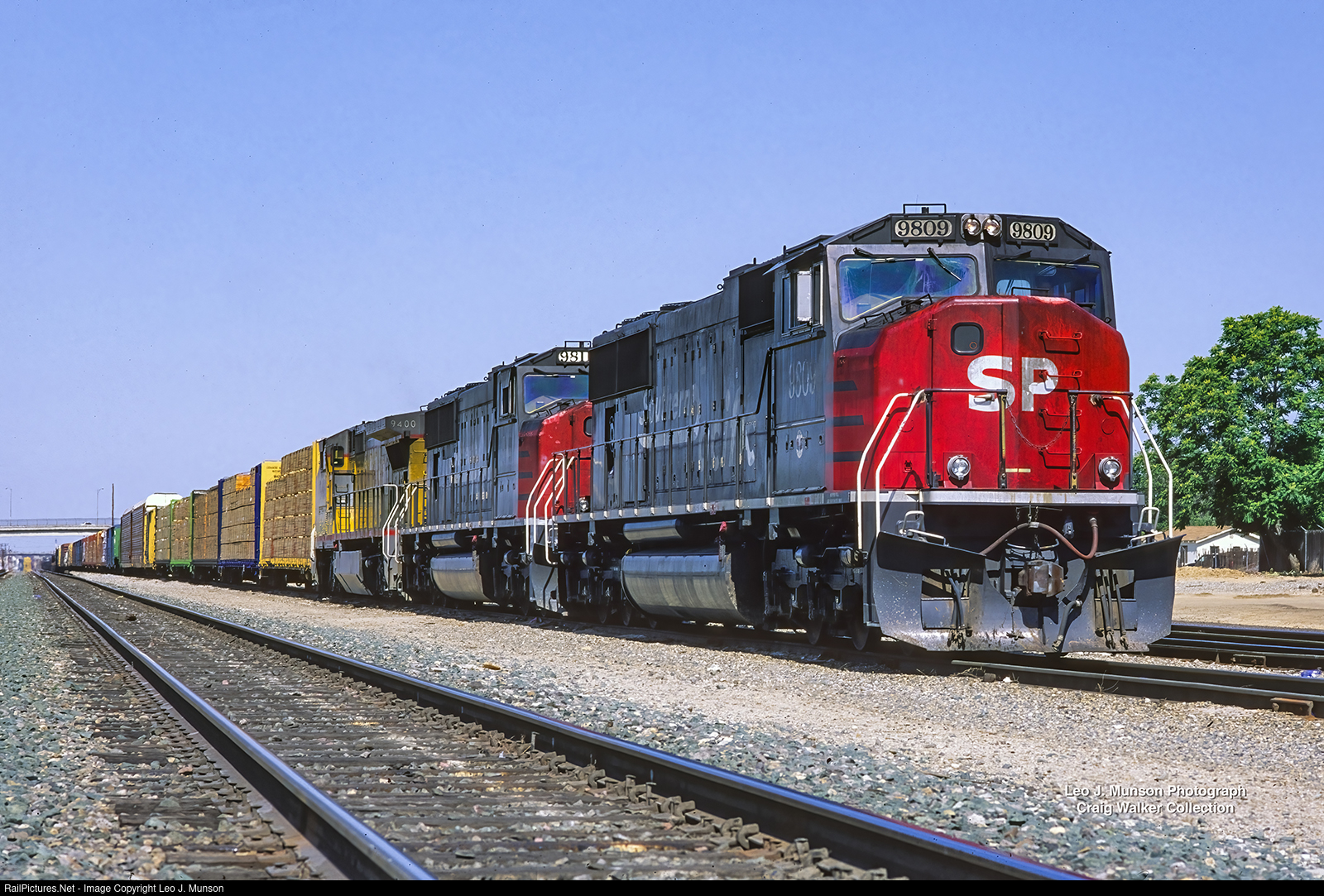 Southern Pacific Railroad SD70M 9809 was built by General Motors Locomotive Group in June 1994, one of 25 of these locomotives acquired by the SP. This fleet proved to be a great purchase by the SP, as they became the backbone of the "I-5 Corridor" trains operating between Los Angeles CA and Portland OR, proving themselves enough that after completion of the Union Pacific's control of the Southern Pacific Railroad occurred on September 11, 1996, the UP purchased 1000 of these SD70M diesels. SP SD70Ms 9809 and 9811, along with UP Dash 8-40CW 7400 (the 1000th Dash 8 locomotive built), await a fresh crew before moving this train across the Tehachapi Mountains and into southern California. On March 6, 2002, SP 9809 would be renumbered Union Pacific 3983. (Bakersfield, California - April 22, 2000) Leo J. Munson Photograph, Craig Walker Collection