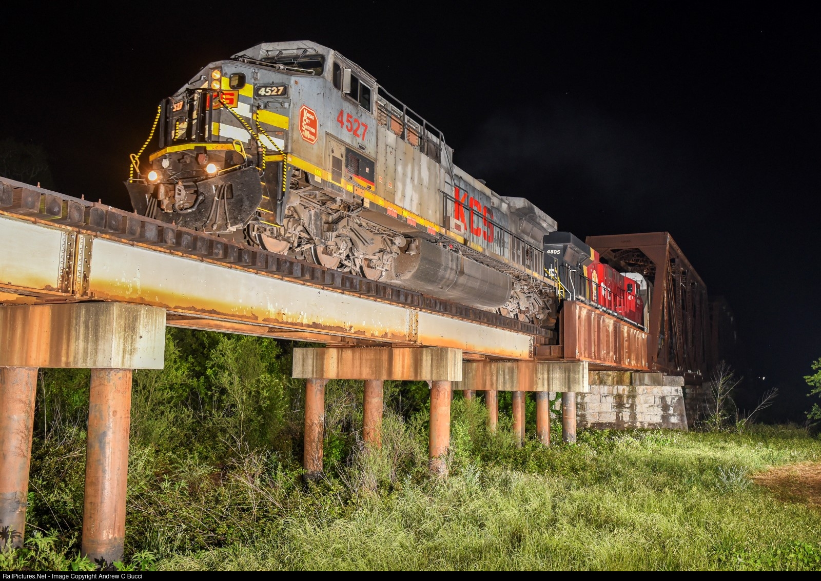 KCSM 4527 still in its grey TFM era scheme heads north across the former Southern Pacific Colorado River Bridge in Wharton Texas on the Macaroni Line.