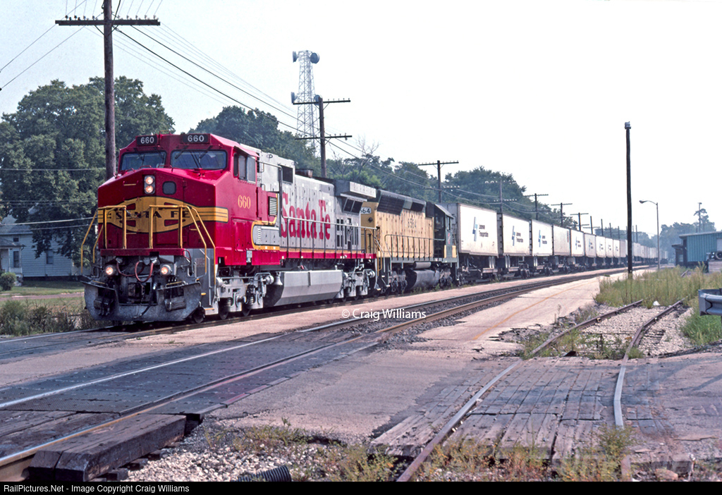 I don't remember a lot of Chicago to KC Q-trains running, so I think this was a little odd for 1995. Also odd was how the Santa Fe found the CNW 6564 unit. The 6564 was the one-off that was rebuilt by the CNW in January 1986 as an SD40R with a 16-cylinder, 3000 HP prime mover. CNW power in 1995 on the Santa Fe was pretty odd, much less this oddball. The train passes through Galesburg in the morning hours.