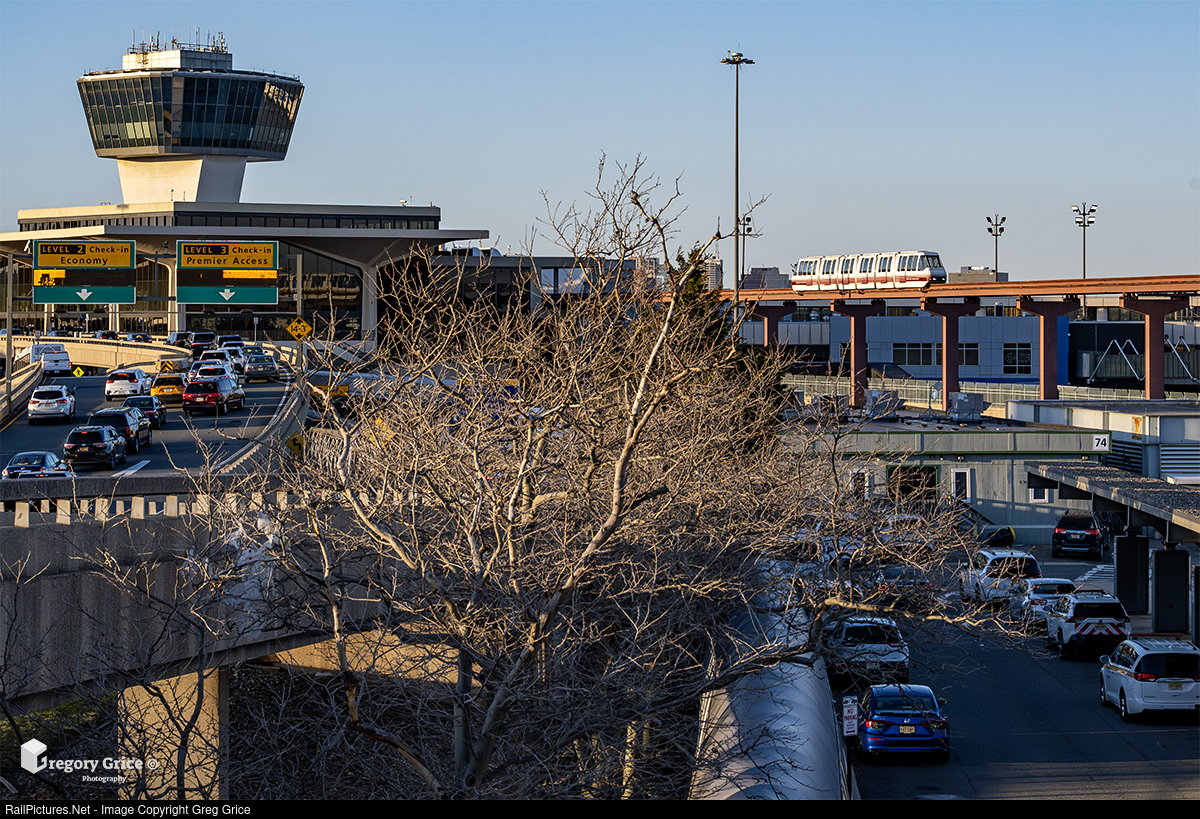 On March 21, 2025, AirTrain Newark Monorail Trainset 1, a Von Roll Mk III, is seen departing Terminal C towards Terminal B at Newark Liberty International Airport in New Jersey. The airport’s massive Ramp Operations Tower, often mistaken for the air traffic control tower, dwarfs the small train.