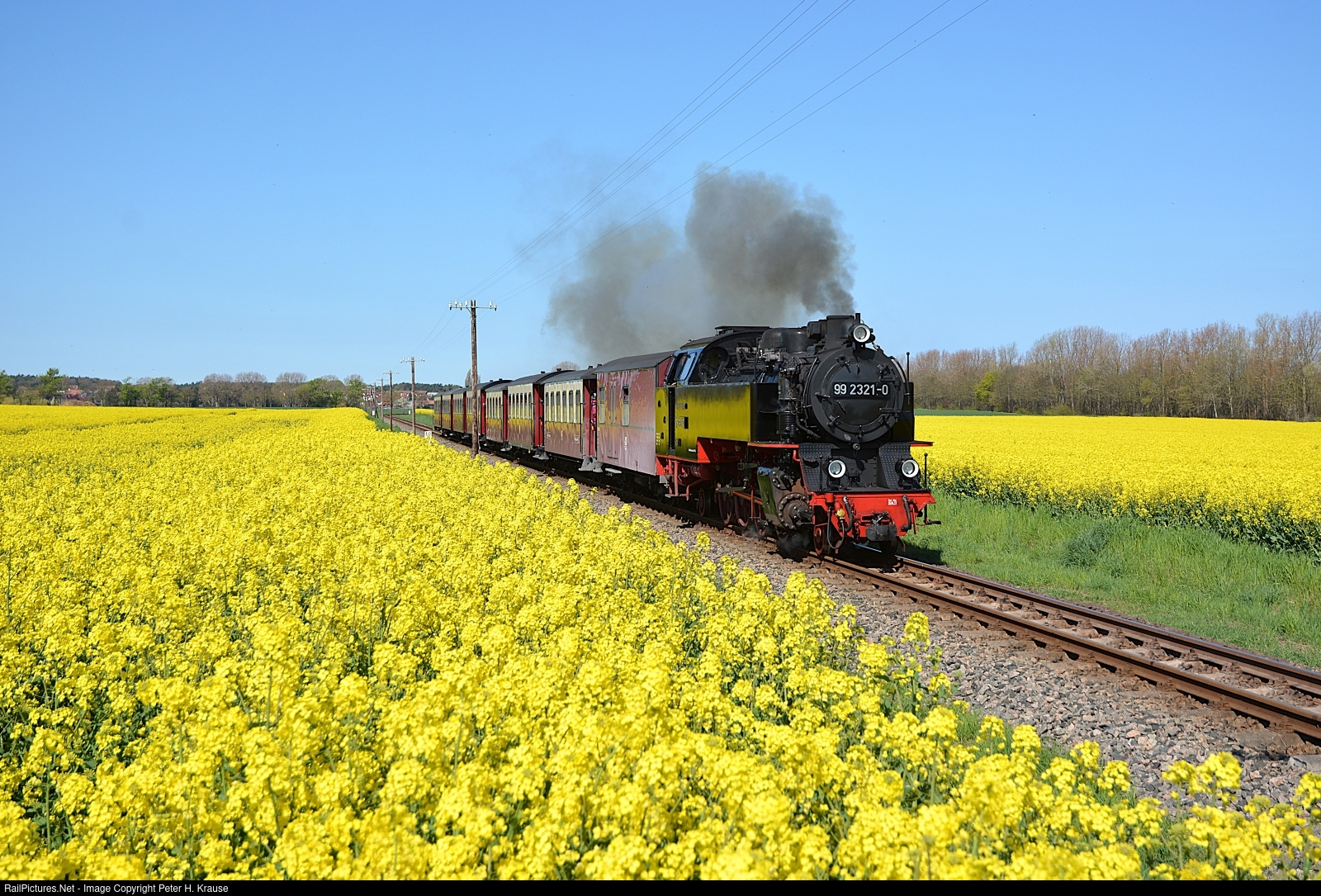 | The canola plants are in full bloom, as 99 2321 runs through the yellow fields on its way to the next stop at Steilküste, close to the Baltic Sea. |