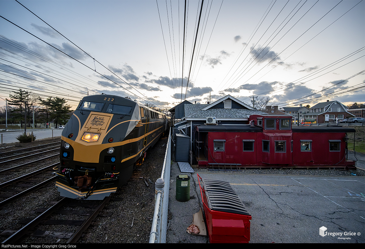 With just a hint of daylight remaining on March 25, 2025, Metro-North's 40th Anniversary "New Haven Railroad" heritage-wrapped GE P32AC-DM, MNCW 222, leads train 1868 past The Depot Darien Youth Center in the Noroton Heights neighborhood of Darien, Connecticut. The Depot, located in the former Noroton Heights stationhouse, features a caboose that serves as an extension of the main building. A discarded pizza, clearly not from New Haven, adds a touch of "local flavor" to the scene.