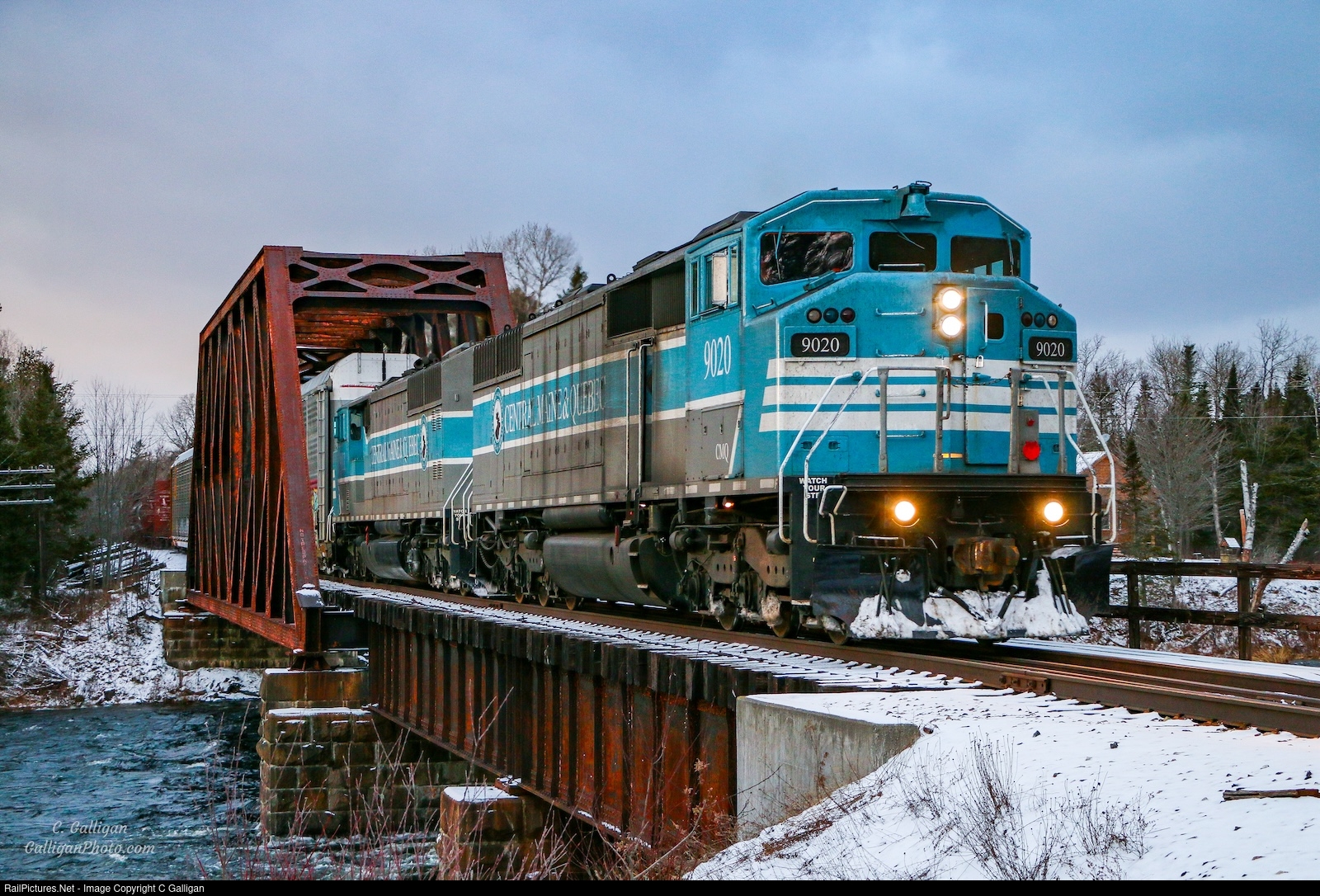 | The light is fading across northern Maine as the last day of 2020 slips away. Darting across the East Outlet of Moosehead Lake is Canadian Pacific train 250. Running on the former Central Maine and Quebec Railroad’s Moosehead Subdivision, a pair proper CM&Q SD40-2F ‘Barns’ are leading. |