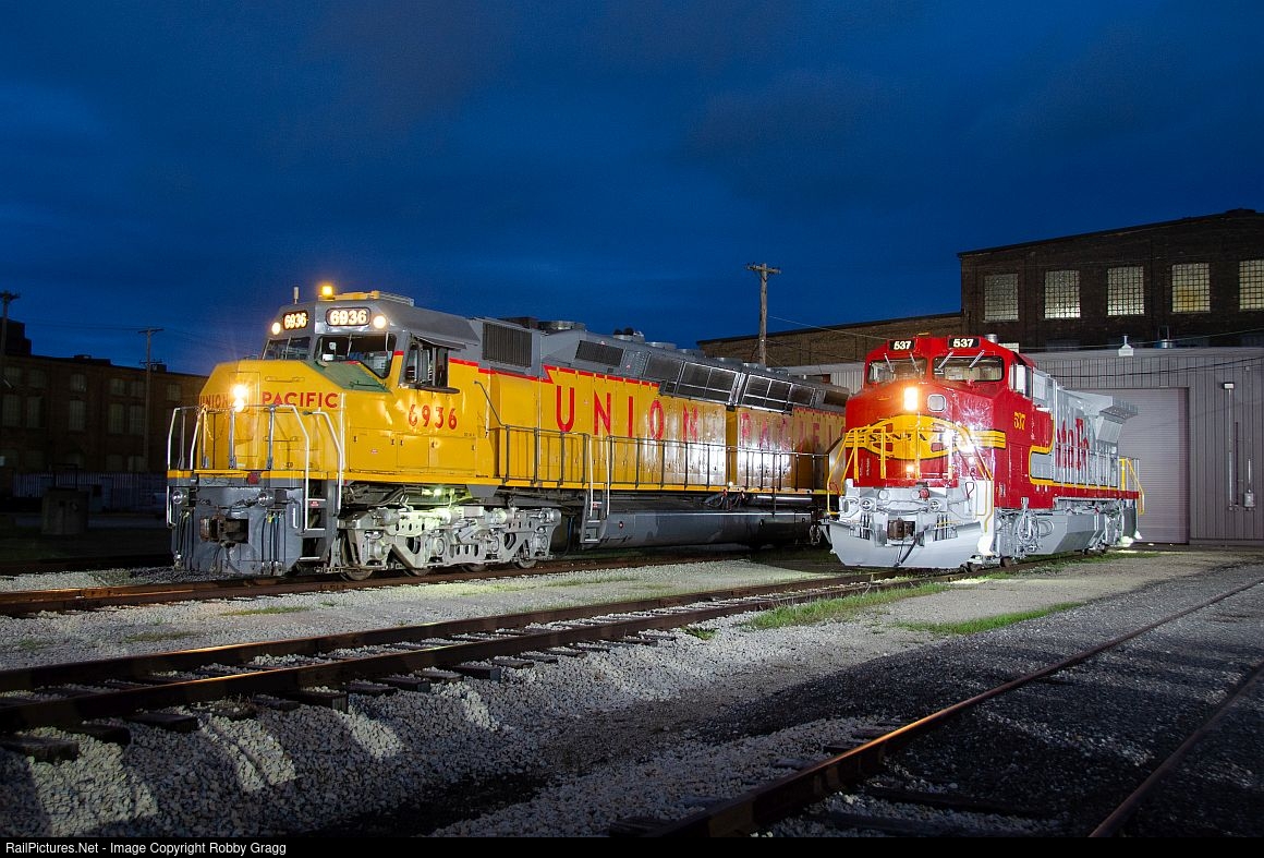 ATSF 537 and UP 6936 pose outside the historic Rock Island shop in Silvis during a night photo session during Silvis Railroad Days. This was the first ever night photo shoot at this historic Rock Island complex.