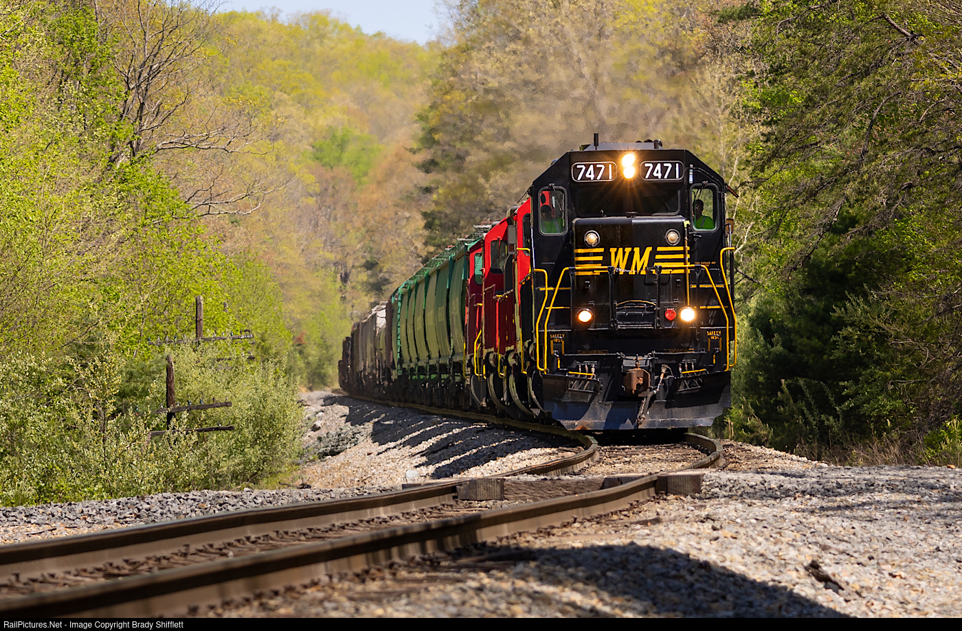 | Using the stretch braking method, engineer Ian Whaley and conductor Eric Strohecker ease the Mountain Local down the west slope of North Mountain at a brisk 40mph. |