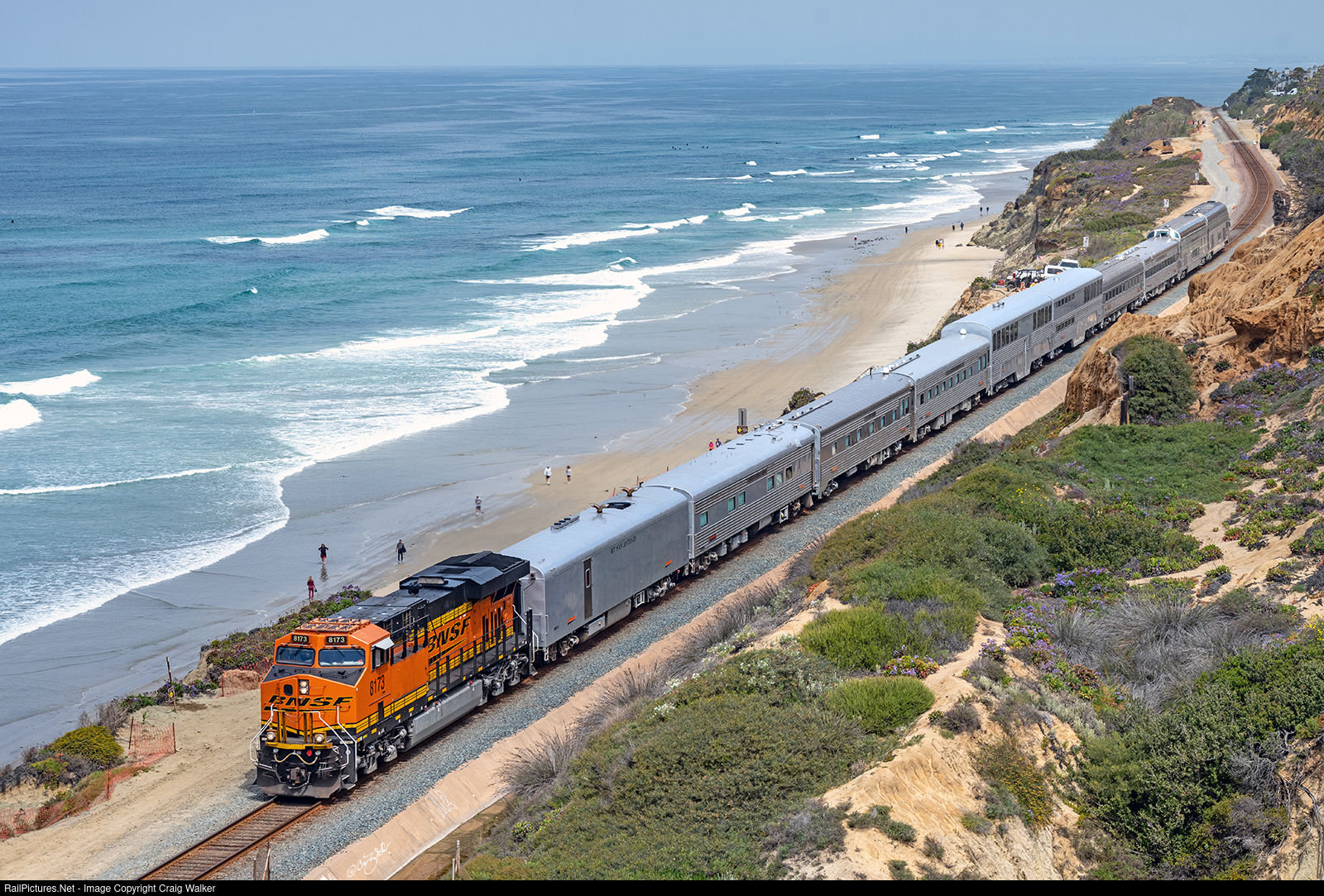 Making the 129 mile (207.6 km) trip from Los Angeles to San Diego is BNSF Officer Special O-LACSDG2-30. Running over 15 hours behind schedule, BNSF Officer Train O-TOPLAC8-26A is now within 40 miles of its destination, Los Angeles. This train is powered by ES44C4 8173, and consists of 10 BNSF business cars. This special loaded passengers in both Fullerton and San Juan Capistrano, and will return to LA later in the afternoon. The next day, on May 1, this train will operate a trip to Barstow and back. It was a gloomy morning along the Pacific Coast until just before this train arrived, and then the sun began to burn the coastal cloud cover away. (Del Mar, California – April 30, 2025)