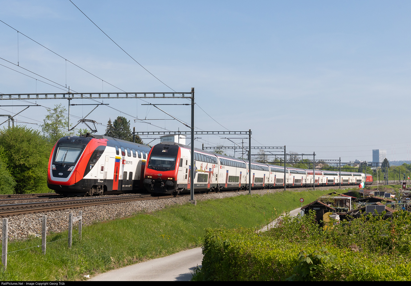 | Accidental encounter of two express trains near Winterthur, both traveling at 125 km/h. Approaching us (right) the IC2000 double-decker commuter train IC 814 of line IC8 from Romanshorn via Zurich-Bern to Brig with cab car Bt and Re 460 # 115 pushing at the end of the train. On the left the “FVD” RABe 502 # 228 as IR 3263 of line IR13 from Zurich via Winterthur-St.Gallen to Sargans. |