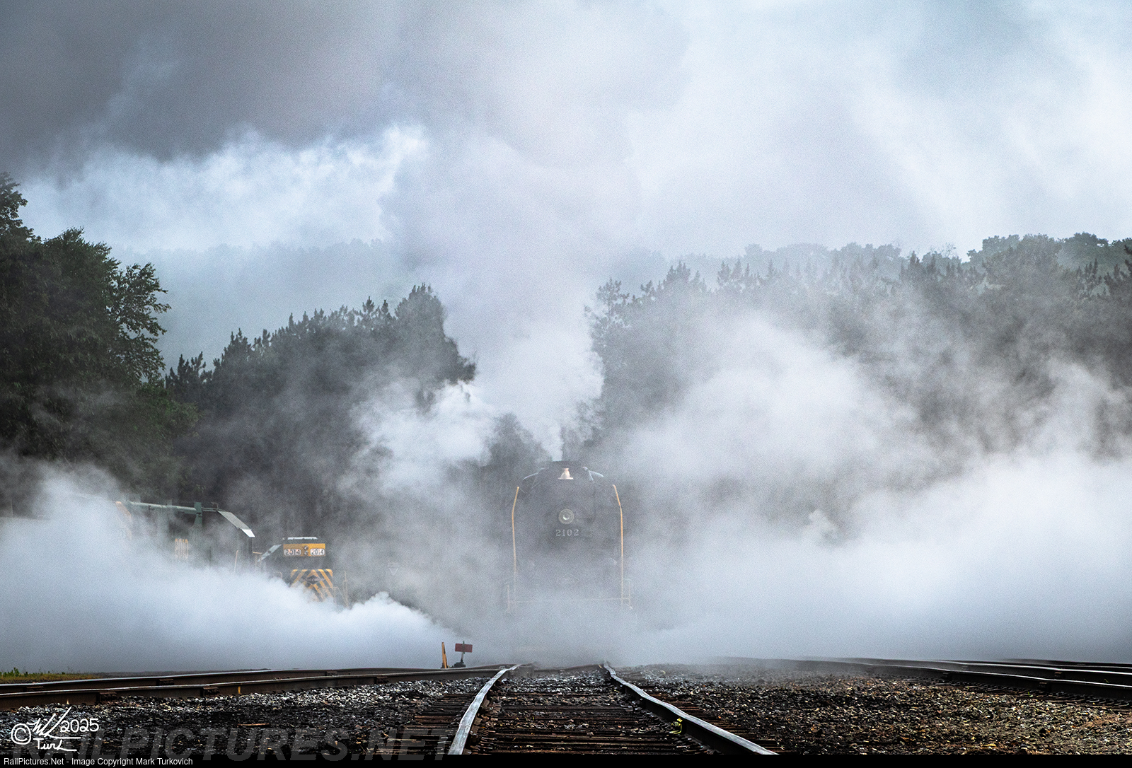 Reading 2102 disappears into a cloud of steam as it reverses out of Jim Thorpe on a foggy June morning.