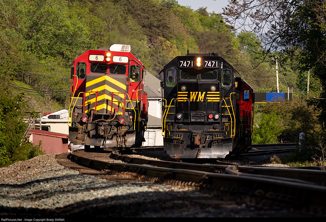 Buckingham Branch Z631 with the Western Maryland 7471 leading clears up in the hole at Brand siding to let Z621 by.