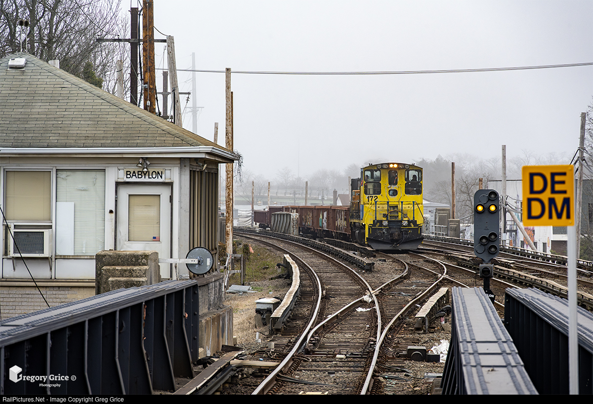 On a foggy March 31st, 2025, Long Island Rail Road Extra 172, with MP15AC 172, approaches Babylon Tower as it tows a short gondola rail train through Babylon, New York on the Montauk Line.