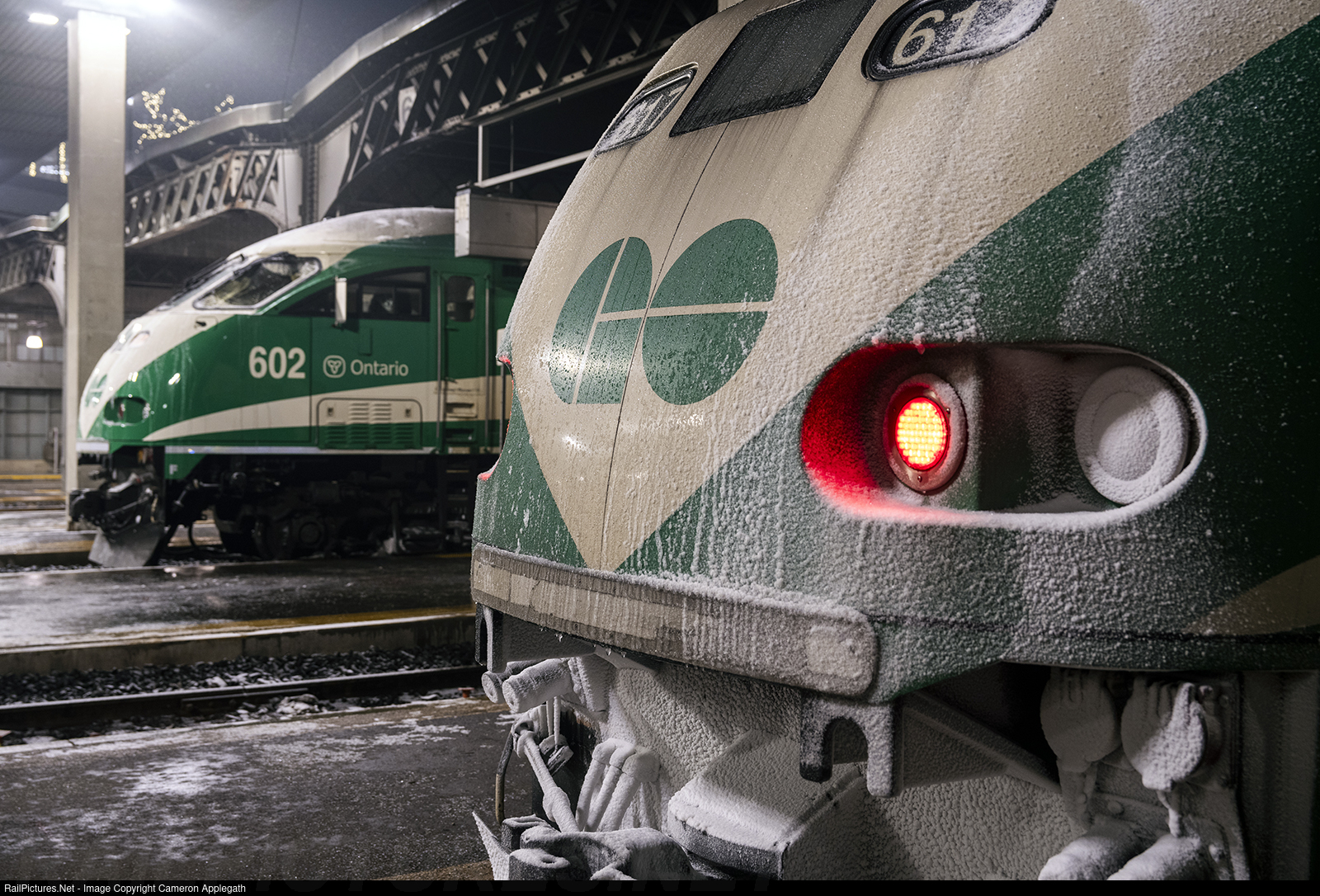 Stay frosty: GO MP40's 617 and 602 stand by, awaiting departure at Union Station, their cabs just poking out from under the shed. The weather this evening is cold, with a hint of moisture as seen on the nose of the 617.