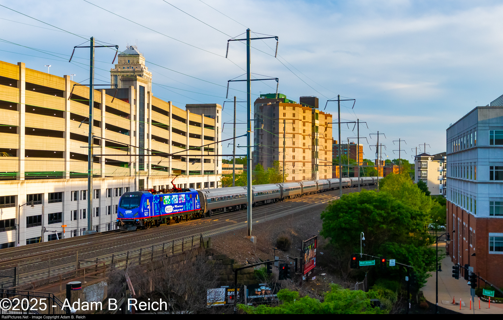 Amtrak's Violet Blue Crayola wrapped ACS-64 is highlighted by golden hour light as it makes its way through the Elizabeth S-Curve on Mother's Day 2025.