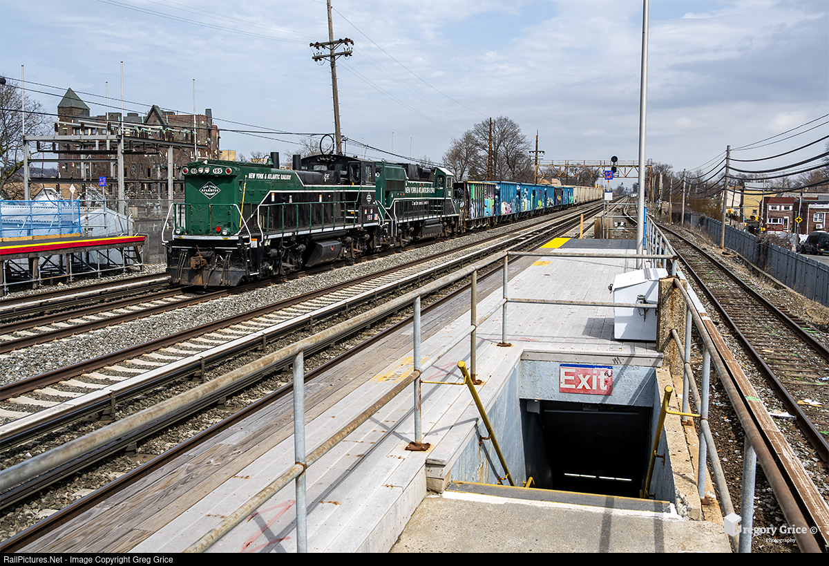 On March 31st, 2025, New York & Atlantic Railway RS-41, with EMD MP15AC 155 leading, passes Hollis Station on the Long Island Rail Road Main Line in Queens, NY. Hollis Station is one of the few remaining stations on the LIRR with wooden platforms, a feature that will disappear in the coming years as part of the railroad's "ADA Package 2" project, which is currently in its early stages.