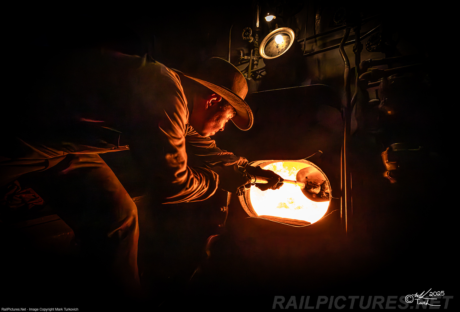 Fireman Sam Kunugi shovels coal into Denver & Rio Grande Western 491's firebox on a cool May night.