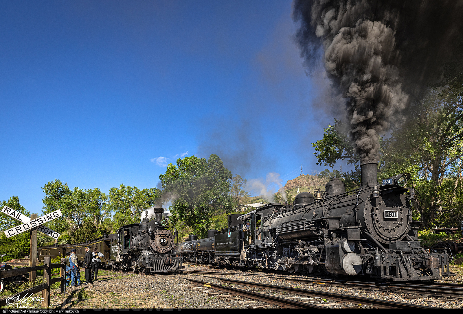 Rio Grande Southern 20 and Denver & Rio Grande Western 491 rest on the point of their trains on a beautiful May morning.
