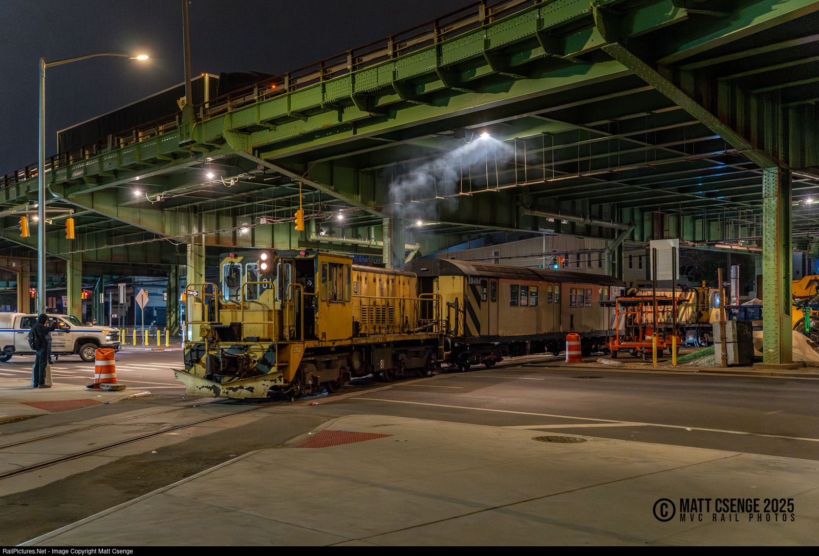 Smoke clouds up under the Gowanus Expressway overpass as New York City Transit Authority (NYCTA) R52 locomotive no. 81 (GE, 1977) leads a "power pack" across 3rd Avenue. The consist, which also included R161 rider car RD404 and R47 locomotive no. 64, were headed to the South Brooklyn Marine Terminal to accept delivery of a 5-car R211A trainset. |