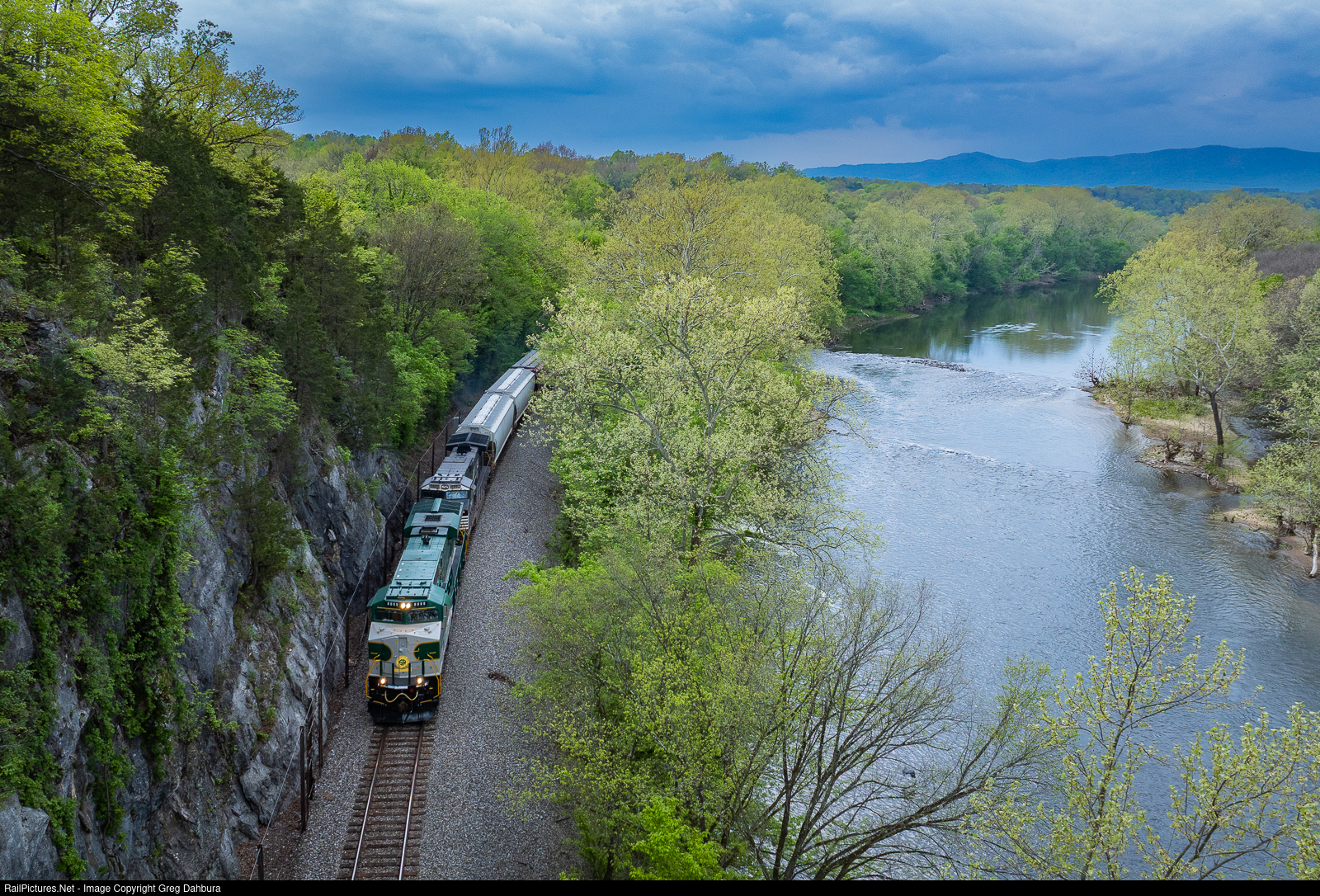 | NS 16T, with the "Southern" heritage unit leading, snakes around the Shenandoah River on a cloudy Friday evening. |