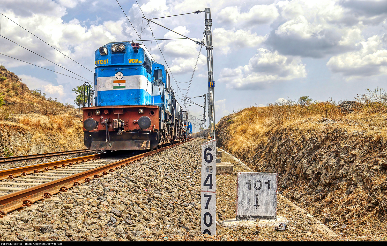 WDM3d #011361 Alco from Pune shed, a derated loco fit only for inferior duties with a flat bed rake carrying a plasser proceeds towards Pune under dramatic clould pattern.