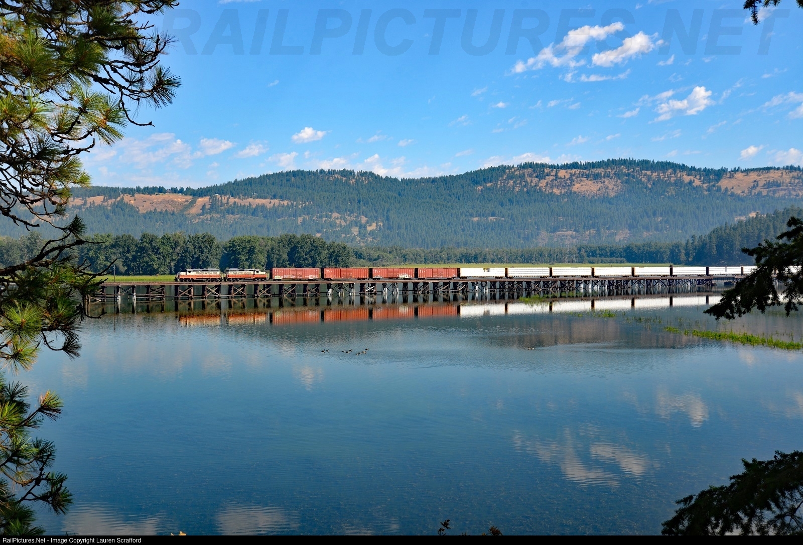 | St. Maries River Railroad, STMA 101 & 103 crossing the Lake Benewah Bridge near Ramsdell, ID with a train of 15 carloads of finished lumber and plywood on August 2, 2019. The carloads were 10 cars of finished lumber and 5 carloads of plywood. STMA 101 and 103 are both rebuilt GP9's that were rebuilt by MK of Boise in 1981. The 2 GP9's were built for the Milwaukee Road as the 292 & 322 in 1959. The Benewah Bridge is on a 1% grade starting in the middle of the bridge. |