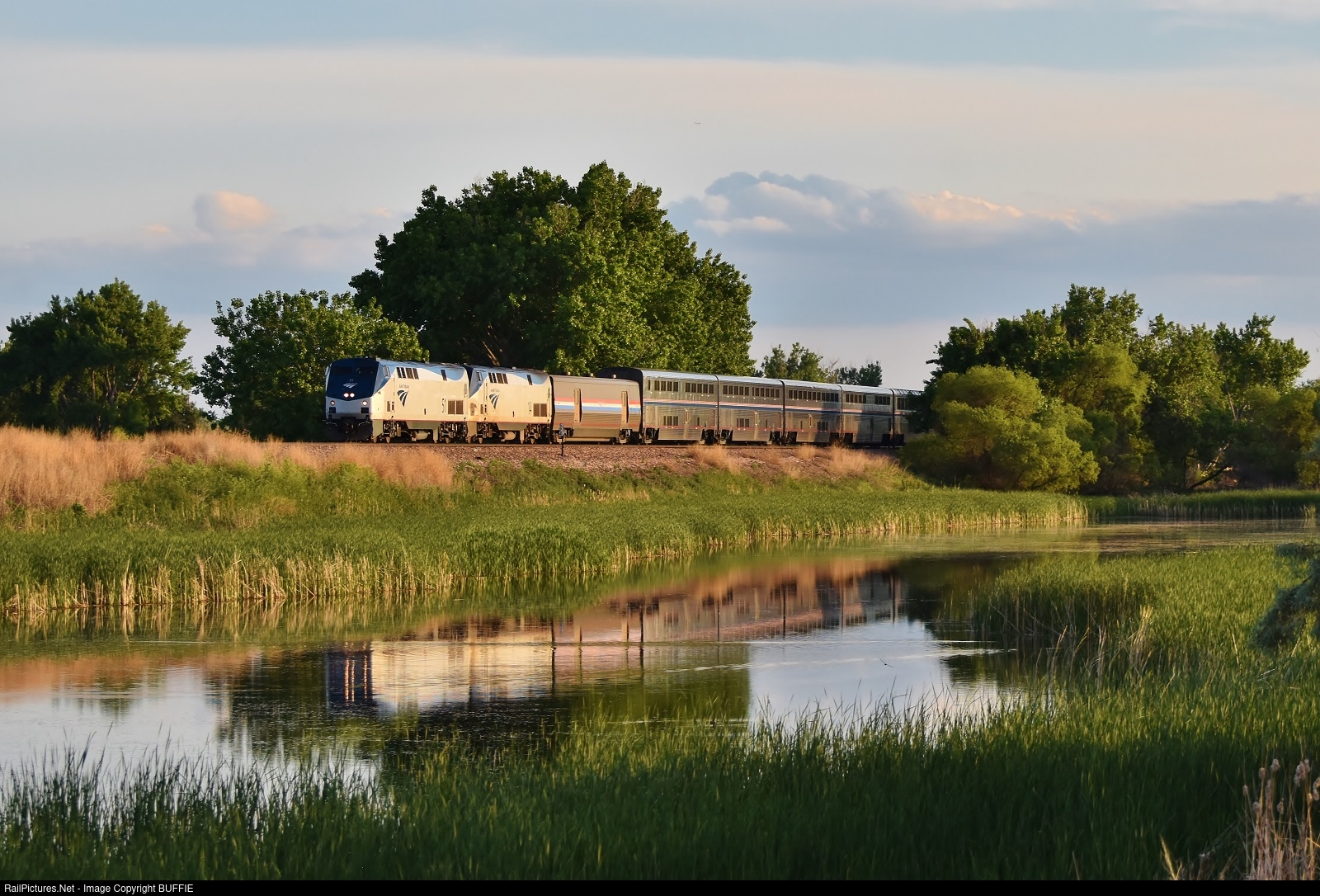 The California Zephyr #6 train reflects off of Barr Lake as it runs west on the Brush Sub through Brighton, Colorado.