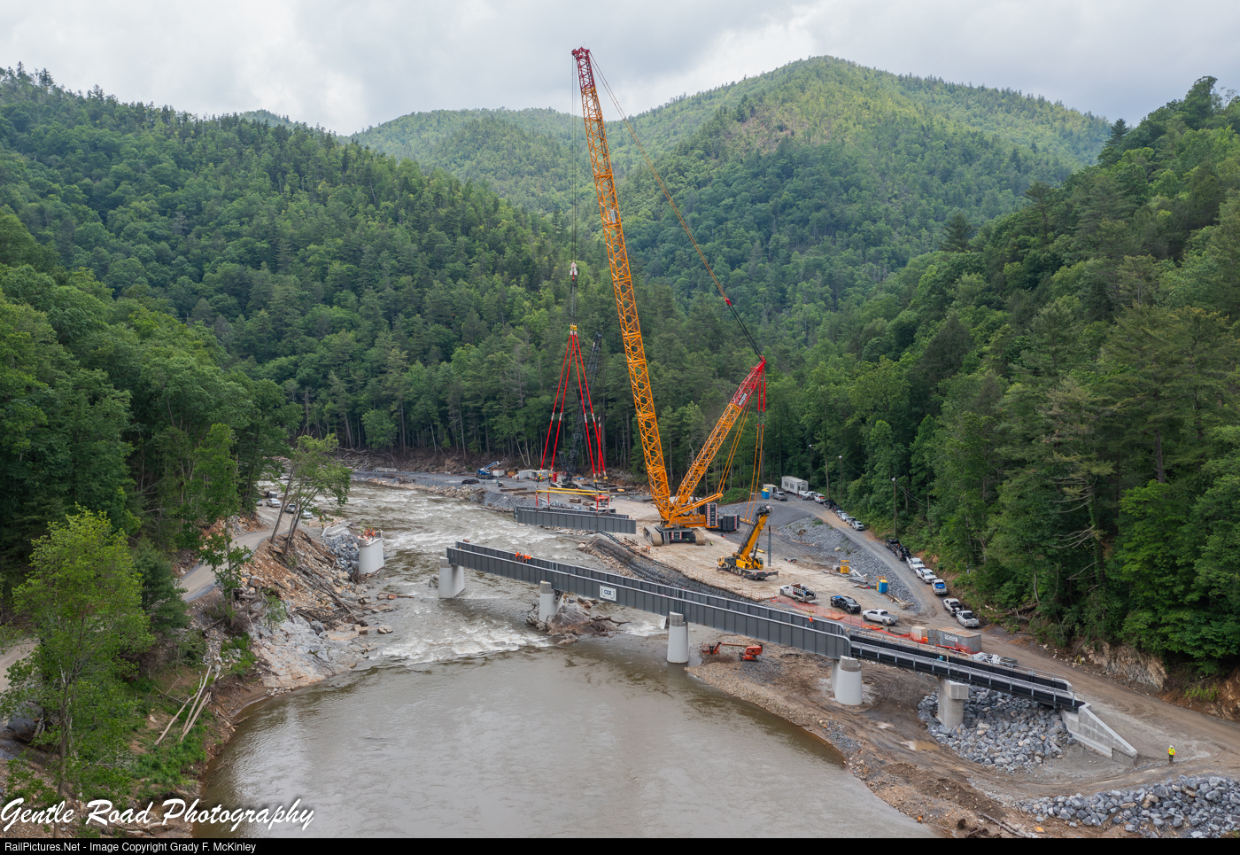 The massive DeMag crane lifts the last remaining refurbished span back into place on the re-built bridge at the south entrance to the Nolichucky gorge on the former Clinchfield mainline. This bridge was washed out during Hurricane Helene on September 30, 2024. The middle four spans were pulled from the river and refurbished post flood.
