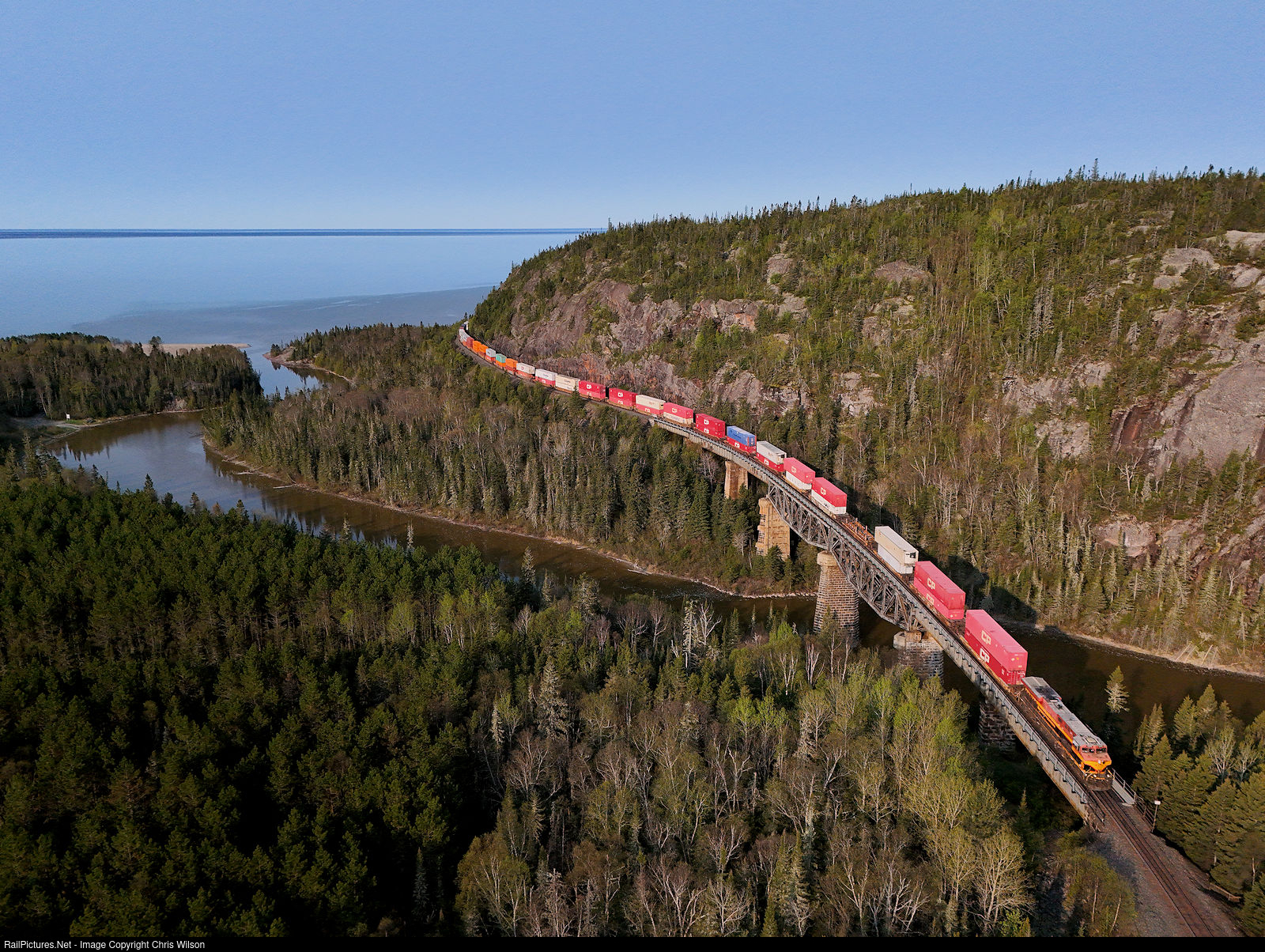 | Under smoke filled skies from wild fires in Northwestern Ontario & Manitoba we see a faded KCS unit on the point of Edmonton to Montreal train 118. Just east out of Middleton the tracks run along the shores of Superior and along the Little Pic River briefly before crossing over on a spectacular looking curved deck trestle. |