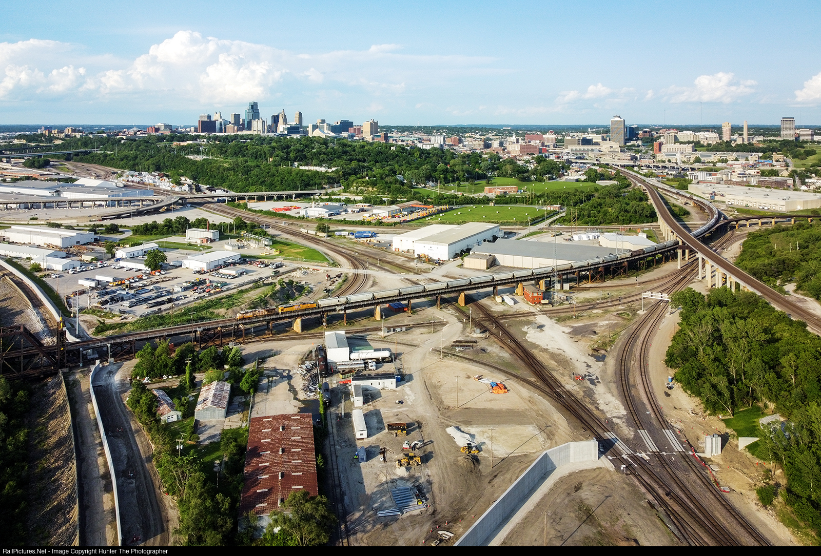 Grain Train Over Santa Fe Junction | Just before 7 in the evening on a sunny Saturday, May 31, 2025, a pair of locomotives lead Union Pacific grain train GSMYCW over Santa Fe Junction and into Kansas City, Kansas, crossing the Missouri state line which cuts right through the diamond below. The tall buildings of downtown Kansas City, Missouri make a great backdrop for the scene.