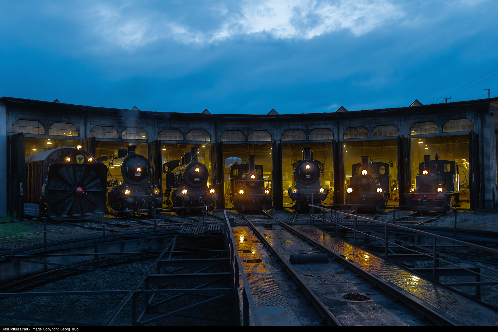 Roundhouse of Bahnpark Brugg by night during the 2025 open doors days, from left to right: Rotary steam snowblower Xrot # 100 "Uri", C 5/6 # 2978, Eb 3/5 # 5819, E 3/3 # 8512, A 3/5 # 705, E 2/2 "Chnurrli", E 2/2 # 1.