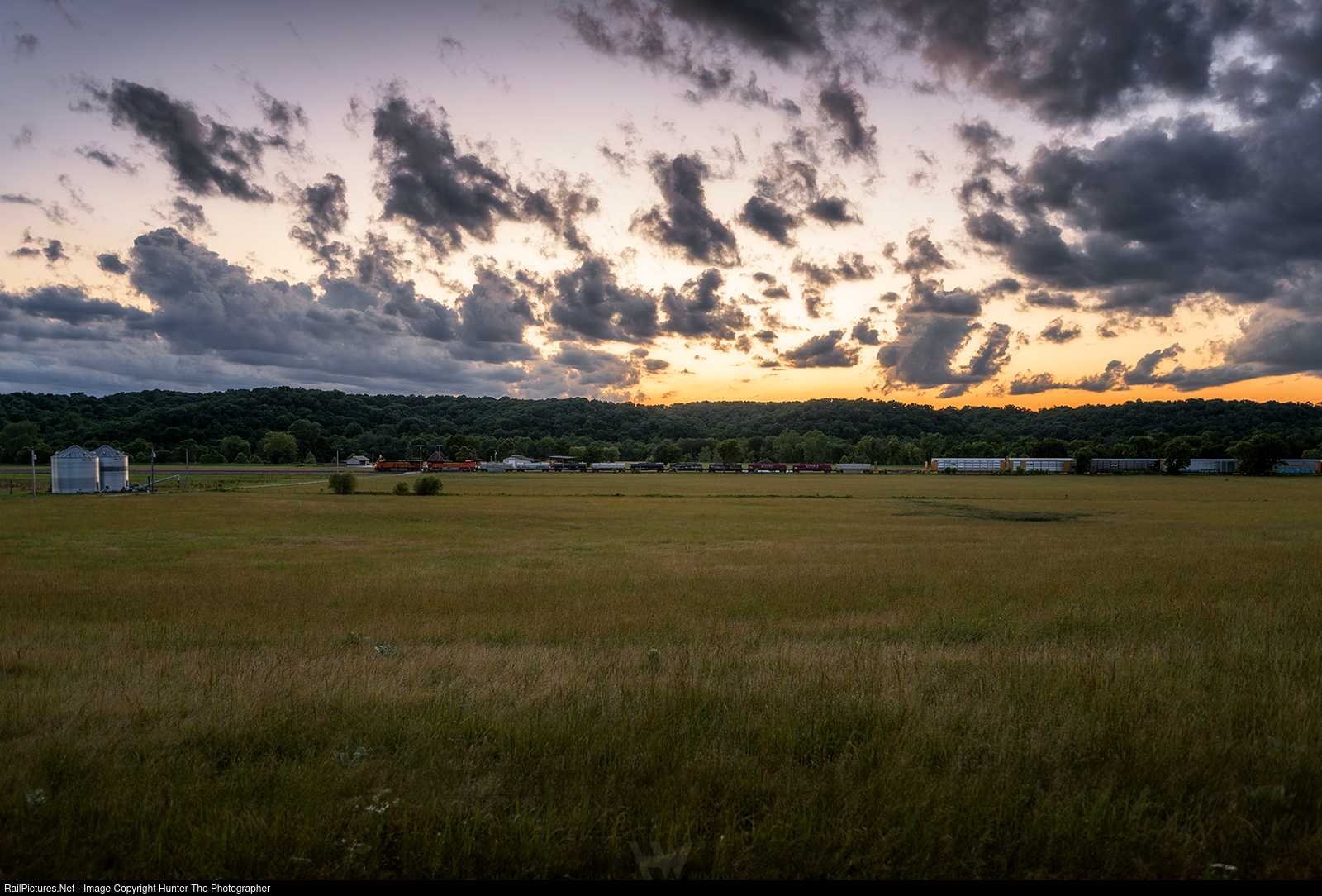 | About fifteen minutes past sunset on a mild Saturday, June 7, 2025 evening, a westbound BNSF manifest freight train passes farmland near Neosho, MO.