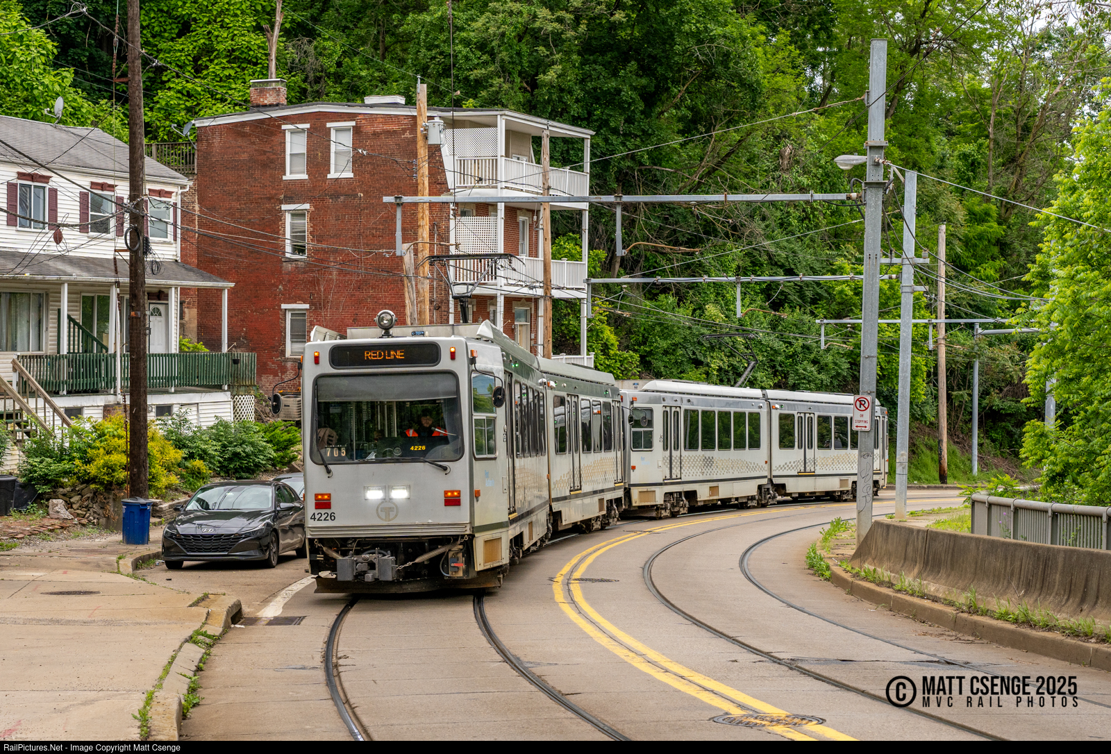 Pittsburgh Regional Transit (PRT) SD-400 trolley 4226 is seen ascending Mount Washington via the Allentown Line, passing some of the few residences that have found footing on the steep slope. |