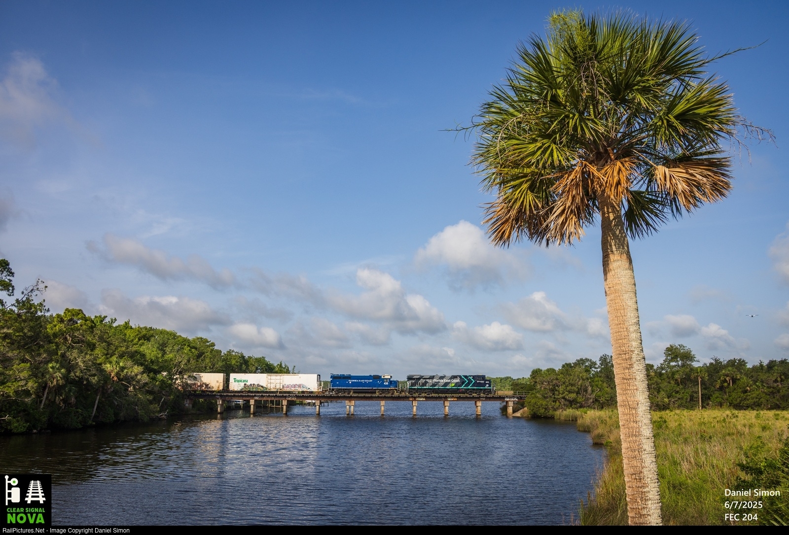 Morning OJ….. A string of the famous refrigerated Tropicana cars is seen crossing the Tomoka River yesterday morning on Florida East Coast Railway (FEC) Train 204.