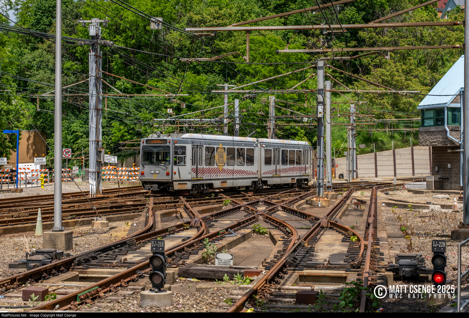 Pittsburgh Regional Transit (PRT) SD-400 LRV no. 4215 is seen clattering across the diamonds at South Hills Junction, where the Allentown Line and the Mount Washington Transit Tunnel meet. Signs and barricades in the background show that the tunnel is closed for long-term maintenance, prompting the diversion of all light rail traffic over Mount Washington on the Allentown Line rather than through it. |