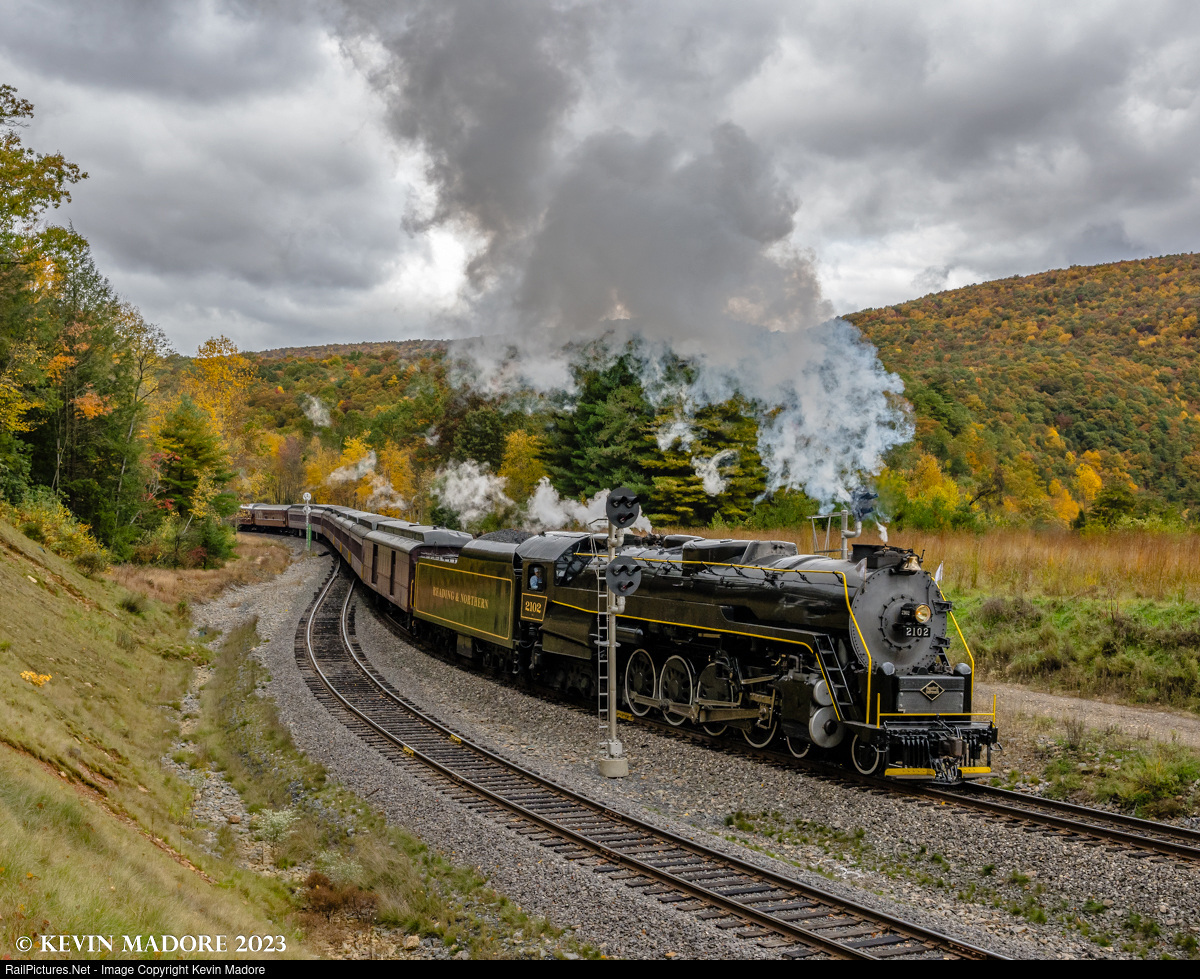 Images from charters and regular operations depicting the Reading & Northern's two steam locomotives, the 4-8-4 Northern #2102 and the 4-6-2 Pacific #425.