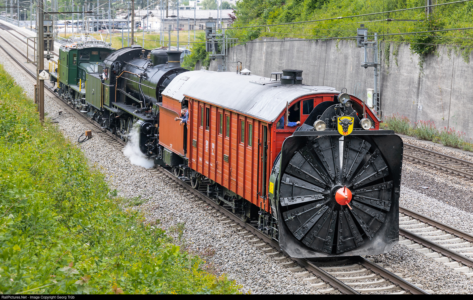 On the occasion of the 2025 Open Depot Days at Bahnpark Brugg AG, members of the Zurich Steam Group organized trips to the bridge on the connecting line (Brugg VL) both Saturday and Sunday. They recreated a train composition similar to those used in the past on the Gotthard route during heavy snowfall or after avalanches. The electric locomotive “Crocodile” Be 6/8 II # 13254 and the steam locomotive "Elephant" C 5/6 # 2978 push the steam snow blower “Rotary” Xrot # 100, which was built in 1896 by Henschel in Kassel, Germany, for the Gotthard Railway. The snow clearance train is on its way back from the bridge on the connecting line to Brugg AG and the railway park. Note: The Be 6/8 II # 13254, which was on display at the Swiss Museum of Transport in Lucerne from 1982 until this spring, is not yet electrically operational. It was towed or pushed during this operation, but the pantograph was raised and the headlights were working.