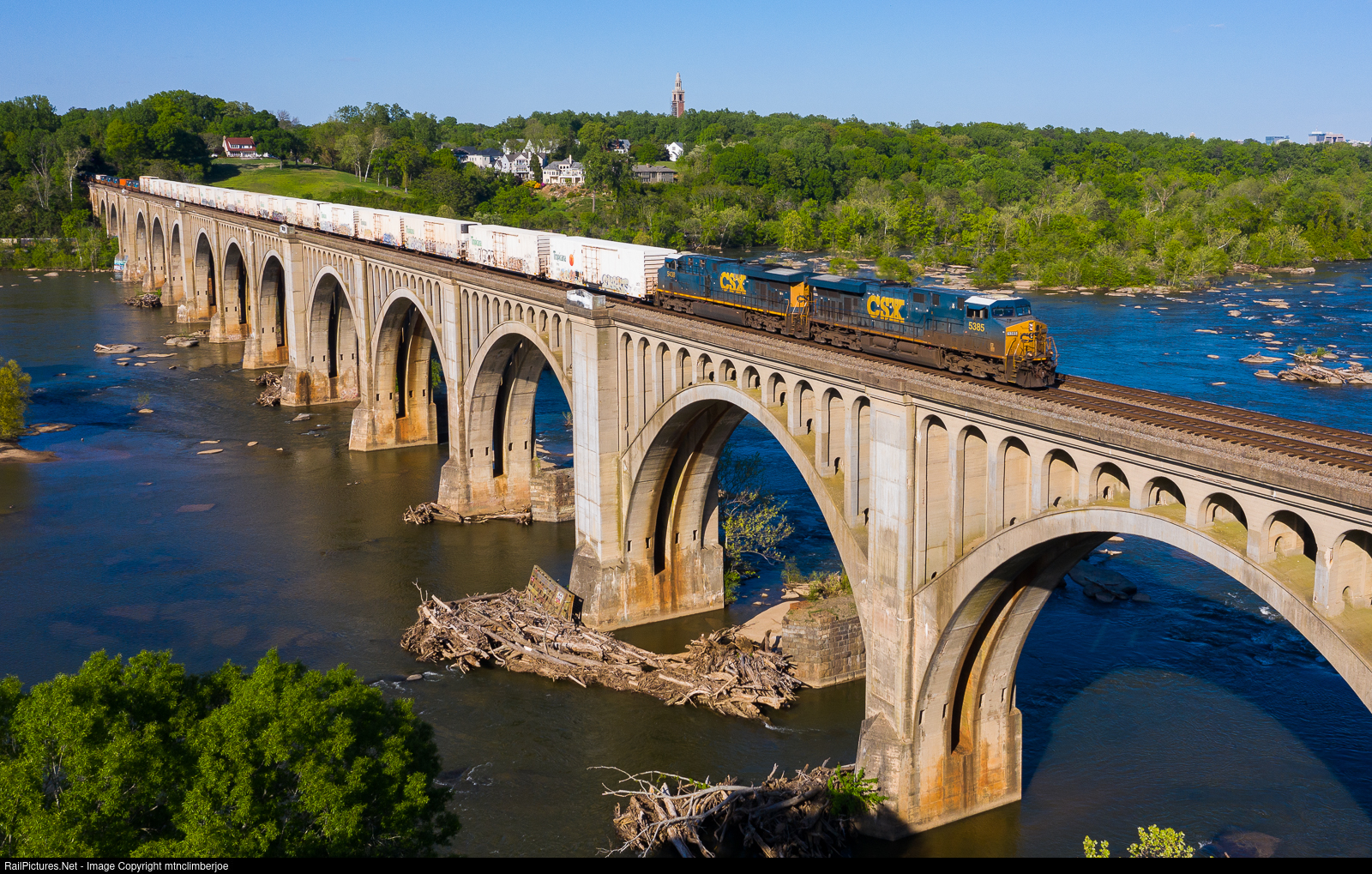 | A pair of ES40DC's lead CSX intermodal train I031 featuring a cut of empty Tropicana reefers on the head end as it heads south through Richmond, Virginia. The train is crossing over the James River on the massive concrete arch bridge built by the ACL and RF&P in 1919.