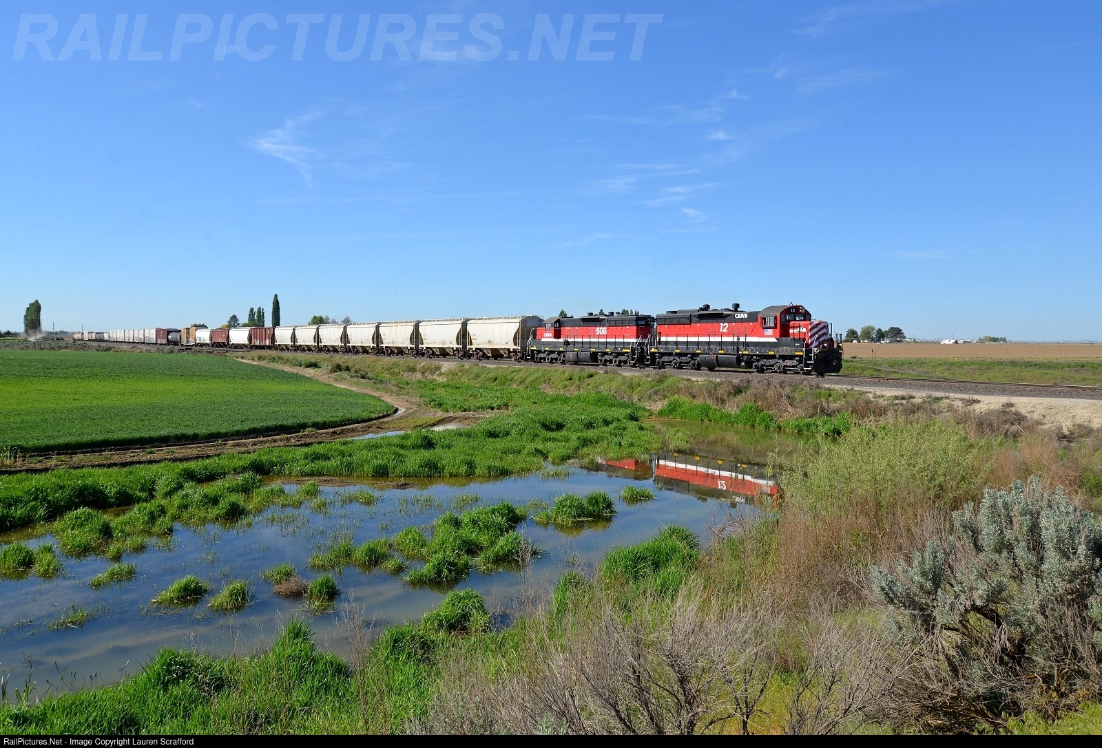 | Columbia Basin Railroad, CBRW 12 leads a 30 car Wheeler turn on May 6, 2025 with CBRW 608, approaching Bassett Jct, WA. Both units are rebuilt SD9's. |