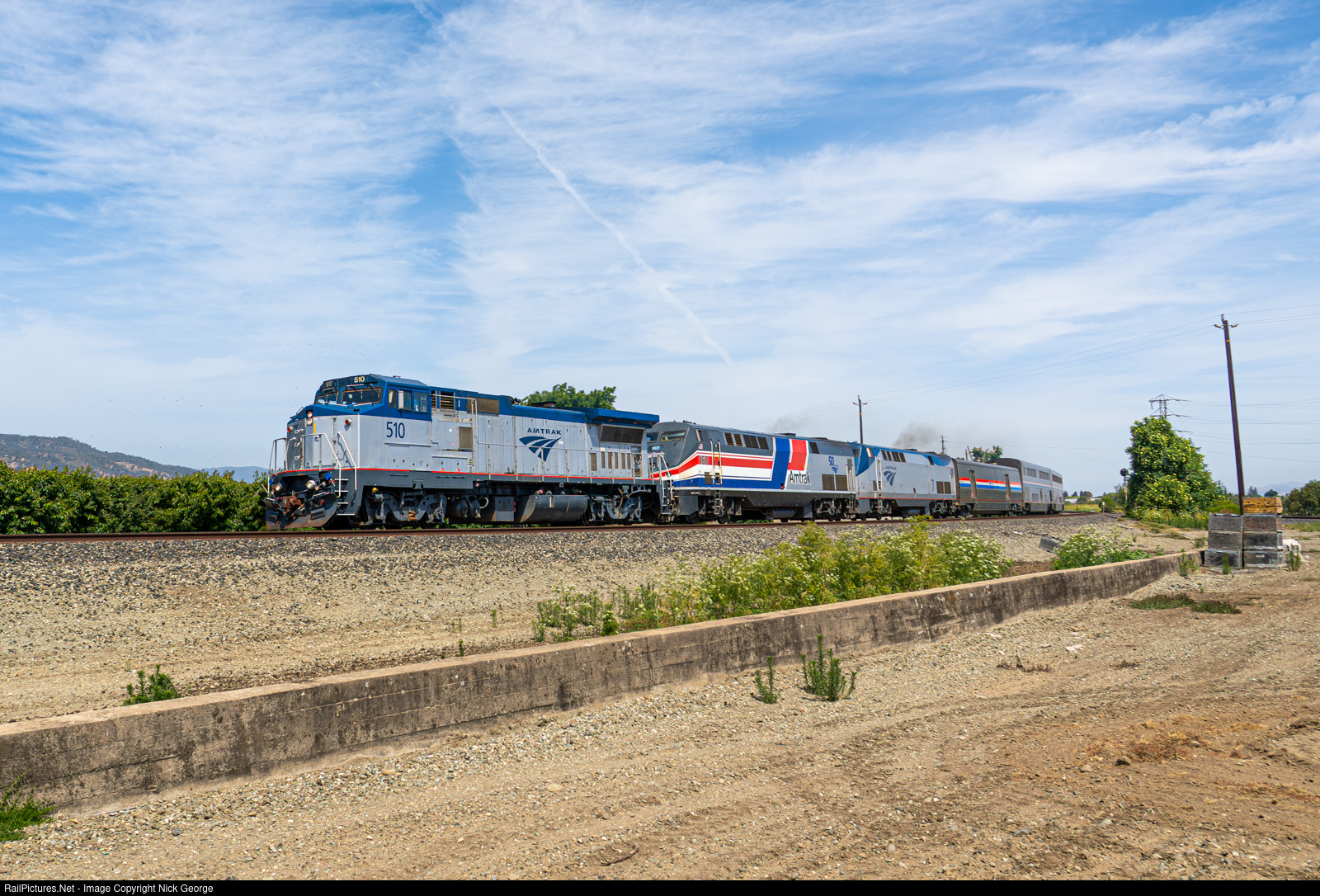 | A rarity in 2025... a Dash 8 leads the southbound Coast Starlight through fruit orchards and garlic fields at the ex-SP location of Carnadero, just south of Gilroy. This is where the Hollister Branch begins, which you can see on the far right side of the image. As an added bonus, this was a triple-header with AMTK 160 in the Pepsi Can scheme behind the leader. |