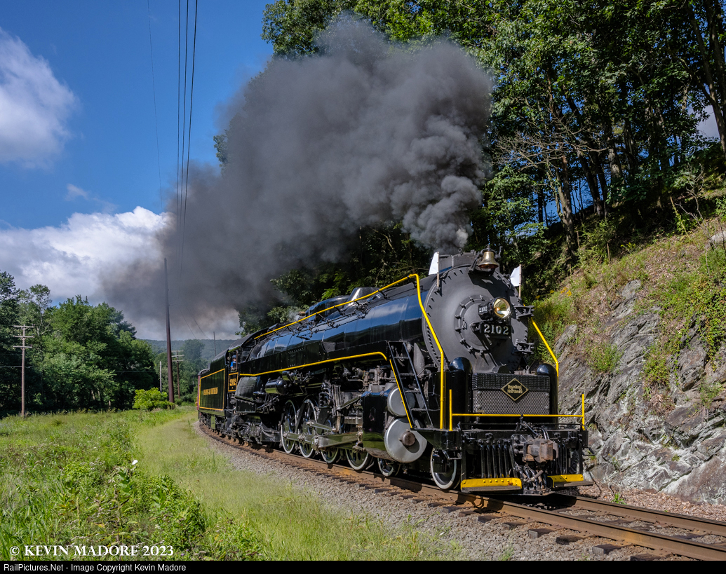 Thundering through West Penn. Under blue skies and scattered clouds, the Reading & Northern's big T-1 Northern #2102 thunders north through the tiny Pennsylvania borough of West Penn, taking one of the line's famous "Iron Horse Rambles" passenger excursions from Reading to Jim Thorpe. Restored over a 6-year period from 2016 to 2022, the 2102 is one of four surviving Reading T-1s and one of two that are either operating or undergoing restoration to operate. The Reading T-1 class engines started out life in 1923 as I-Class, 2-8-0 Consolidations, but between 1945 and 1947, 30 of these locomotives were modified to the configuration seen here. Designed as heavy freight locomotives, these beasts had a theoretical 79,100 lbs of tractive effort with their booster engines running. When the steam era was drawing down in the late 1950s, the Reading Company used 4 of these engines to pull fan excursions all over their rail network over a 5 year period, which the company referred to as "Iron Horse Rambles." When the 2102 returned to operation in 2022, the present-day Reading & Northern chose to revive that historic name for their high-end passenger excursions, which now run several times each summer, to the delight of not only the passengers, but the throngs of photographers who chase each trip in the hope of capturing shots just like this one.