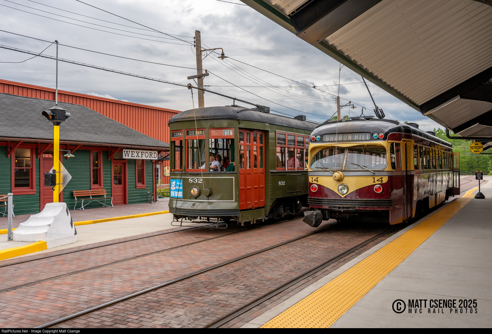 Philadelphia Suburban Transportation Co. trolley 14 and New Orleans Public Service Co. trolley 832 are seen passing on Volunteer Blvd at the Pennsylvania Trolley Museum. The former was built by the St. Louis Car Co. in 1949, and the latter by the Perley Thomas Car Works in 1922. Interestingly the 832 has eleven siblings in preservation at various groups, but also 35 of the cars are still in daily service on home rails in New Orleans! NOPSI is one of three transit systems to use 5'-2½" Pennsylvania trolley gauge, so 832 was compatible with the museum trackage without any modification. At left is Wexford Trolley Station, which was built in 1908 by the Pittsburgh, Harmony, Butler & New Castle Railway.
