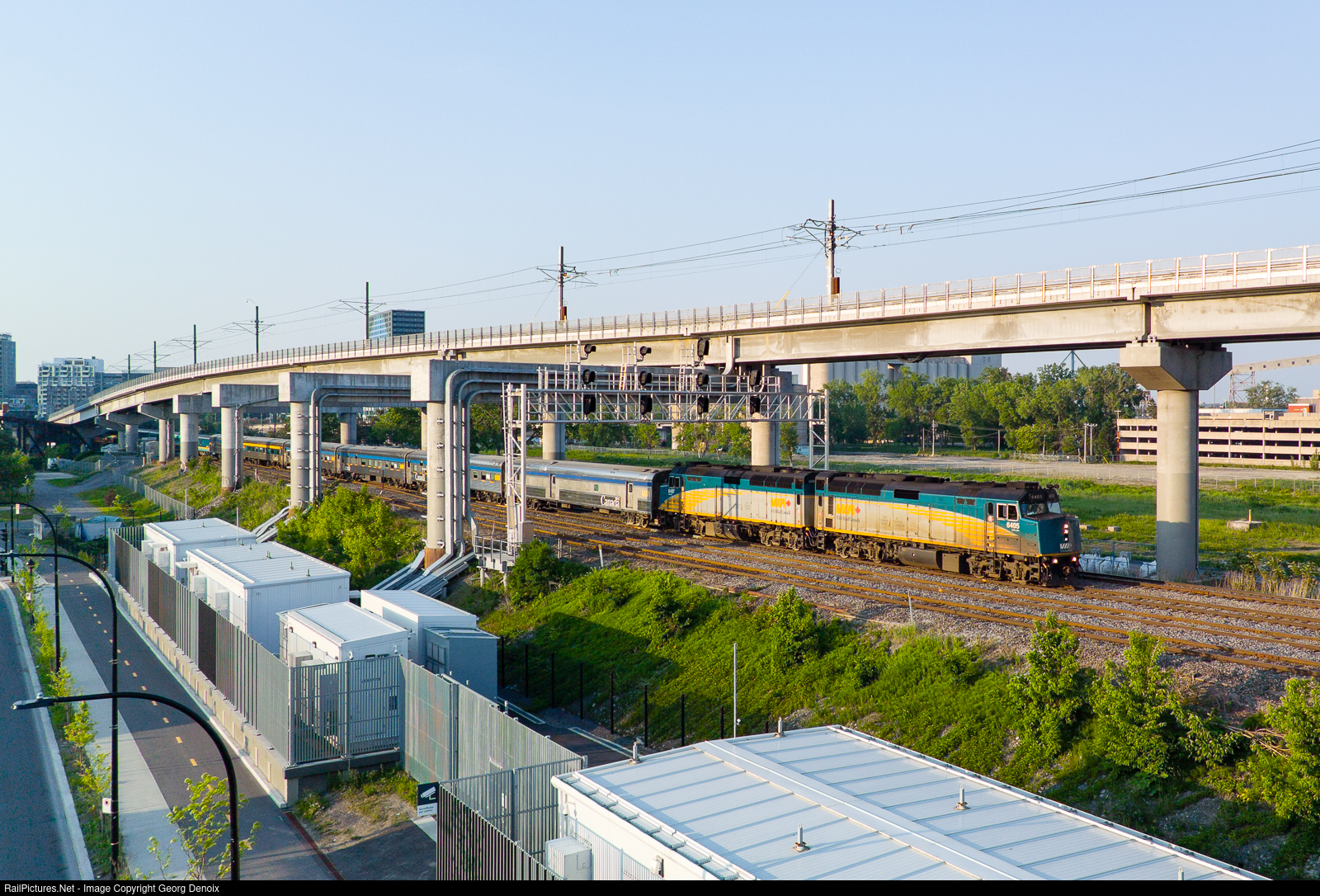 | VIA Rail's Ocean (no 14) is leaving Montreal on a sunny evening in early June, passing underneath the recently constructed REM elevated tracks, with substation infrastructure visible in the foreground. The head end section is made up of vintage Budd equipment, followed behind by British built Renaissance cars. |