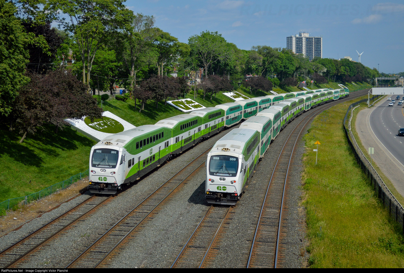 "High speed" meet! A pair of GO Transit trains (outbound on the left, inbound on the right) runs along the highway in Sunnyside.